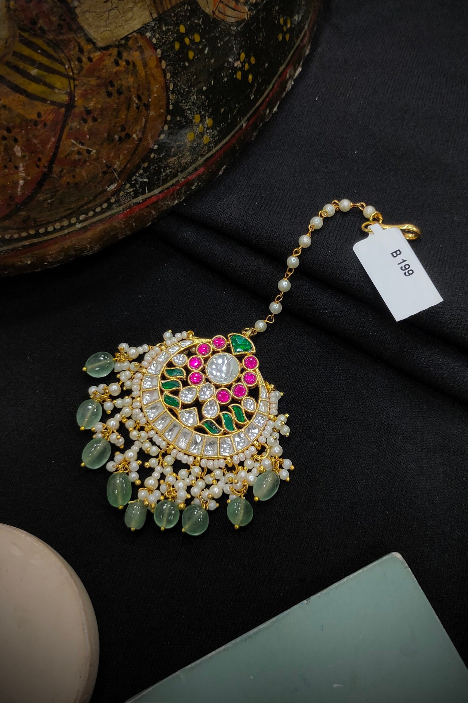 Explore our Pachi/Jadau Kundan MangTika, made from durable Brass and adorned with classic Rajwadi and Gold plating. This traditional piece adds a touch of timeless elegance to any outfit. Elevate your look with our Pachi/Jadau Kundan MangTika, a symbol of Indian heritage and sophistication.