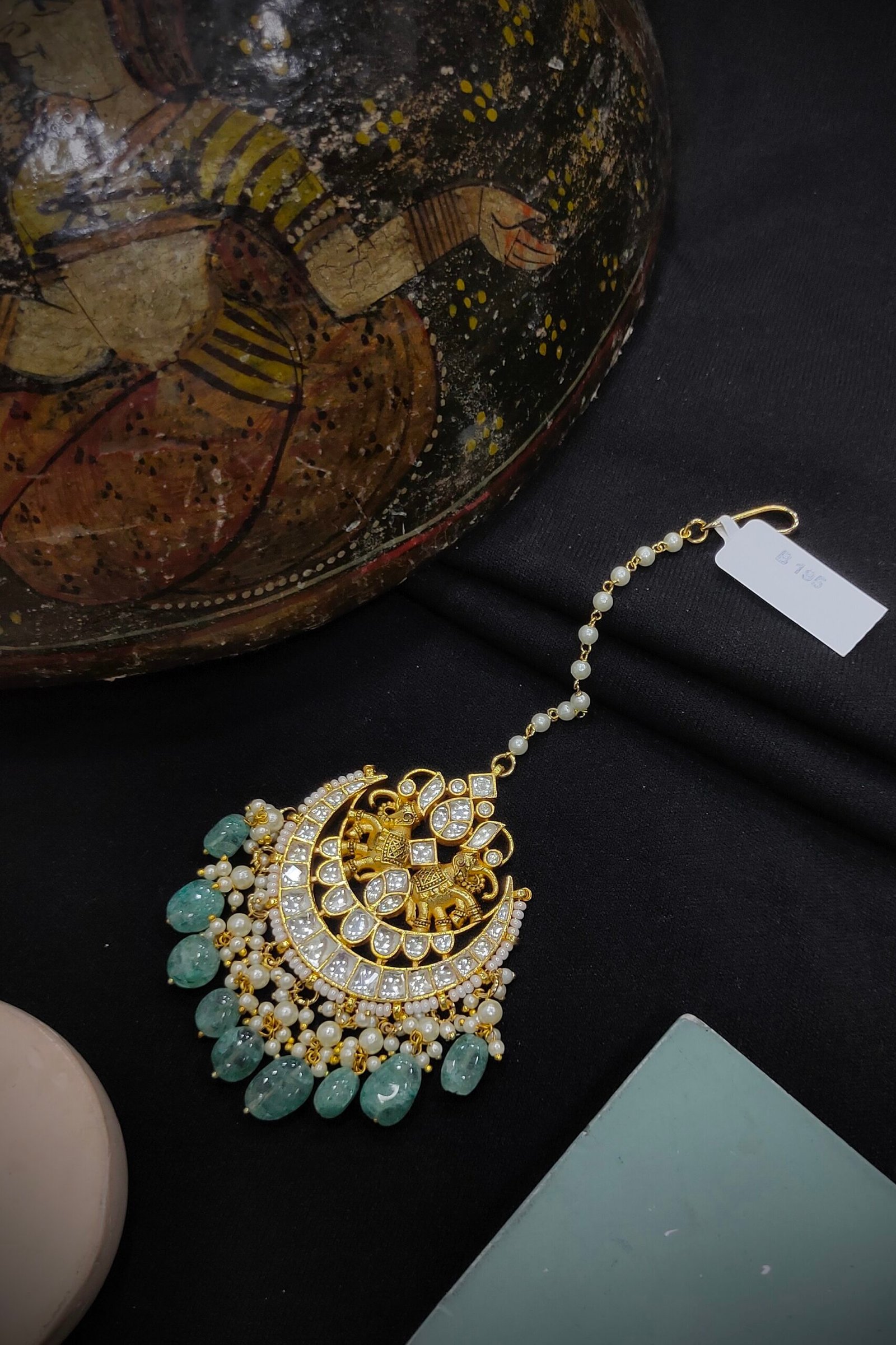 Explore our Pachi/Jadau Kundan MangTika, made from durable Brass and adorned with classic Rajwadi and Gold plating. This traditional piece adds a touch of timeless elegance to any outfit. Elevate your look with our Pachi/Jadau Kundan MangTika, a symbol of Indian heritage and sophistication.