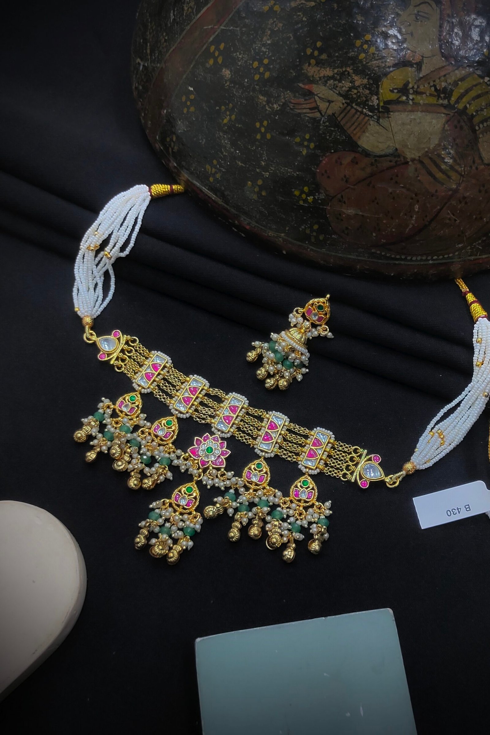 Make a statement of timeless elegance with our Pachi Kundan Choker & Necklace Set, a luxurious blend of traditional craftsmanship and regal charm. This set features a beautifully handcrafted choker for a bold, elegant neckline and a matching long necklace for layered grandeur – both adorned with authentic Pachi Kundan stones and detailed meenakari/enamel work.