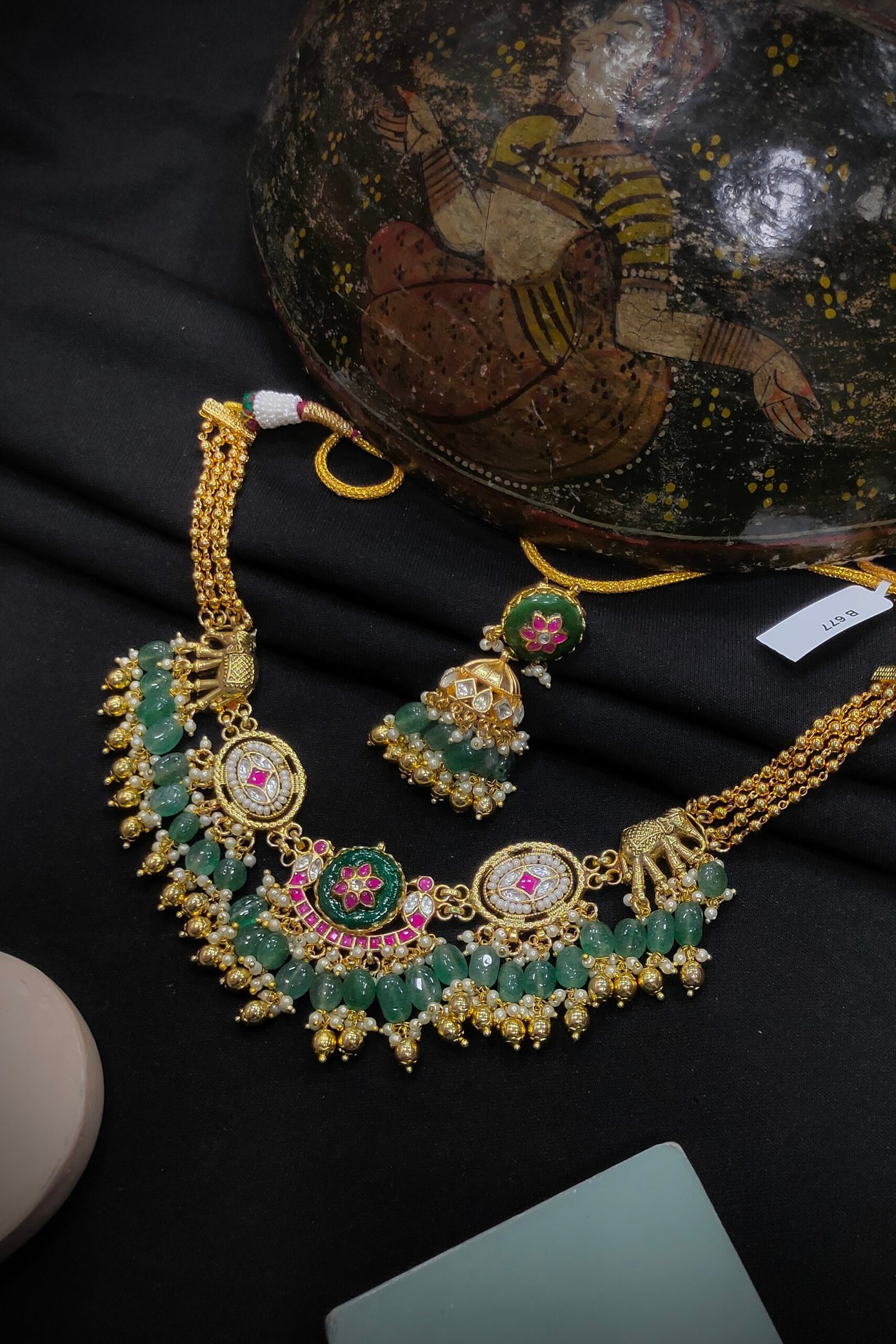 Make a statement of timeless elegance with our Pachi Kundan Choker & Necklace Set, a luxurious blend of traditional craftsmanship and regal charm. This set features a beautifully handcrafted choker for a bold, elegant neckline and a matching long necklace for layered grandeur – both adorned with authentic Pachi Kundan stones and detailed meenakari/enamel work.
