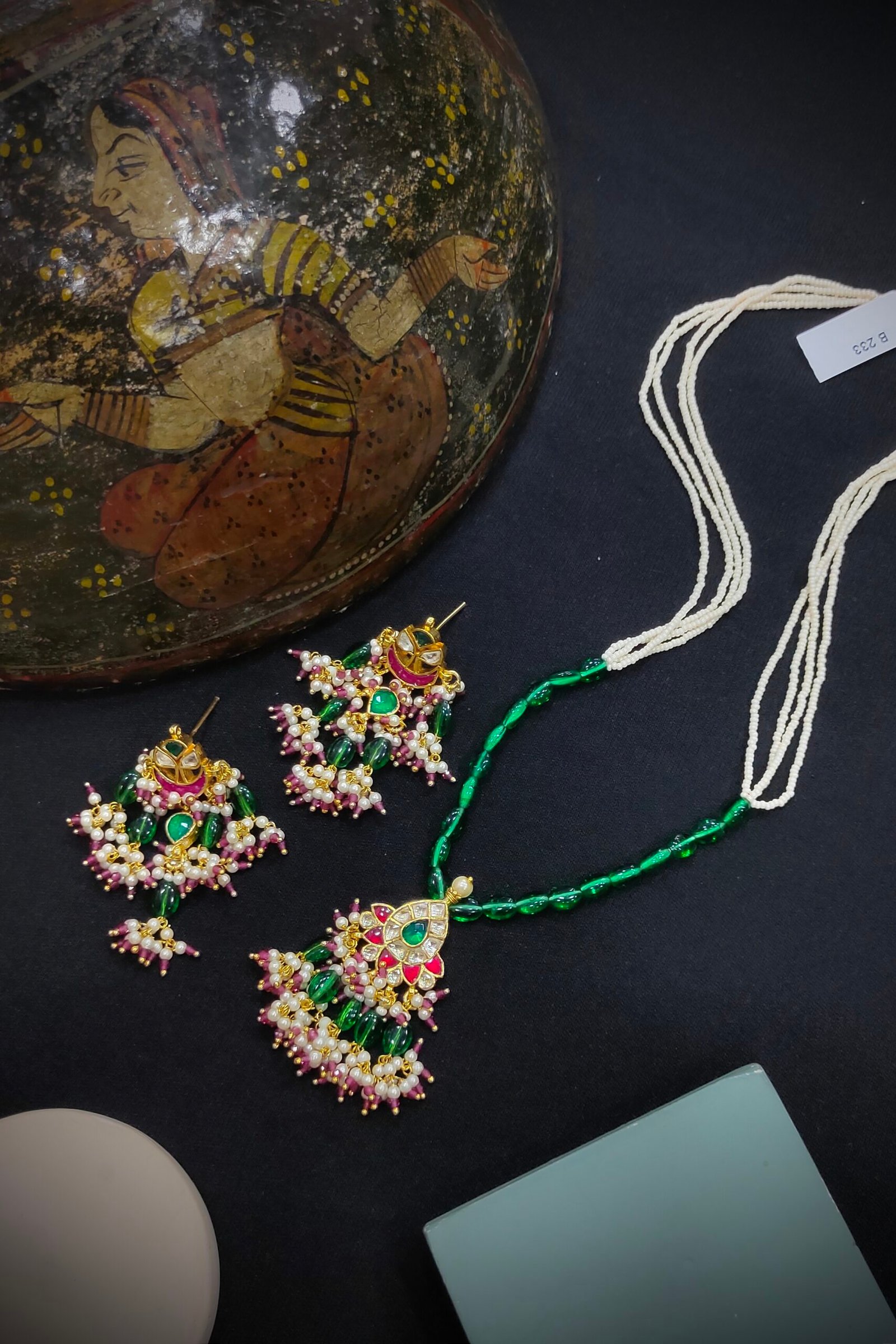 “Elegant and traditional, Pachi Kundan pendant sets feature intricate handcrafted designs adorned with vibrant gemstones and rich enamel work. Perfect for festive occasions and weddings, these sets add a royal charm to any outfit.”