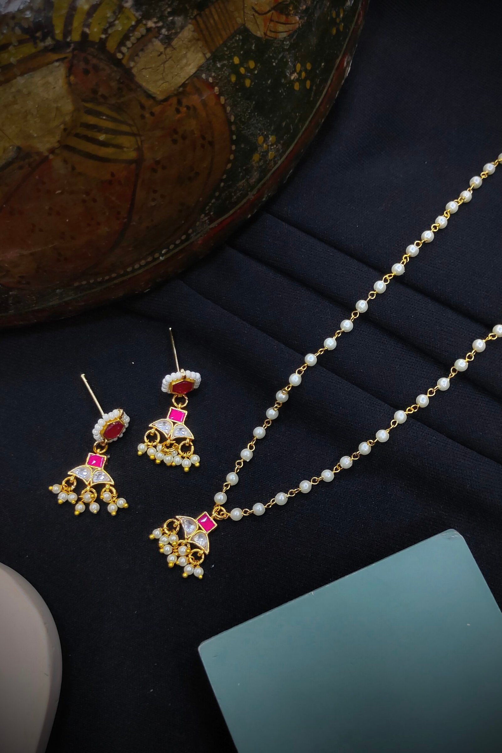 “Elegant and traditional, Pachi Kundan pendant sets feature intricate handcrafted designs adorned with vibrant gemstones and rich enamel work. Perfect for festive occasions and weddings, these sets add a royal charm to any outfit.”