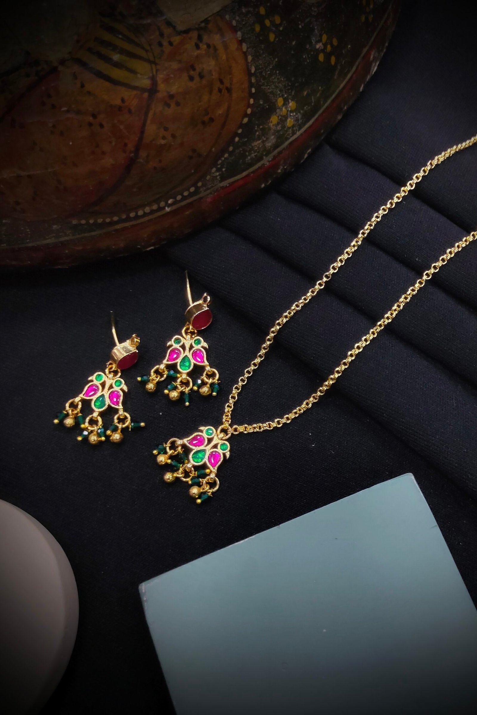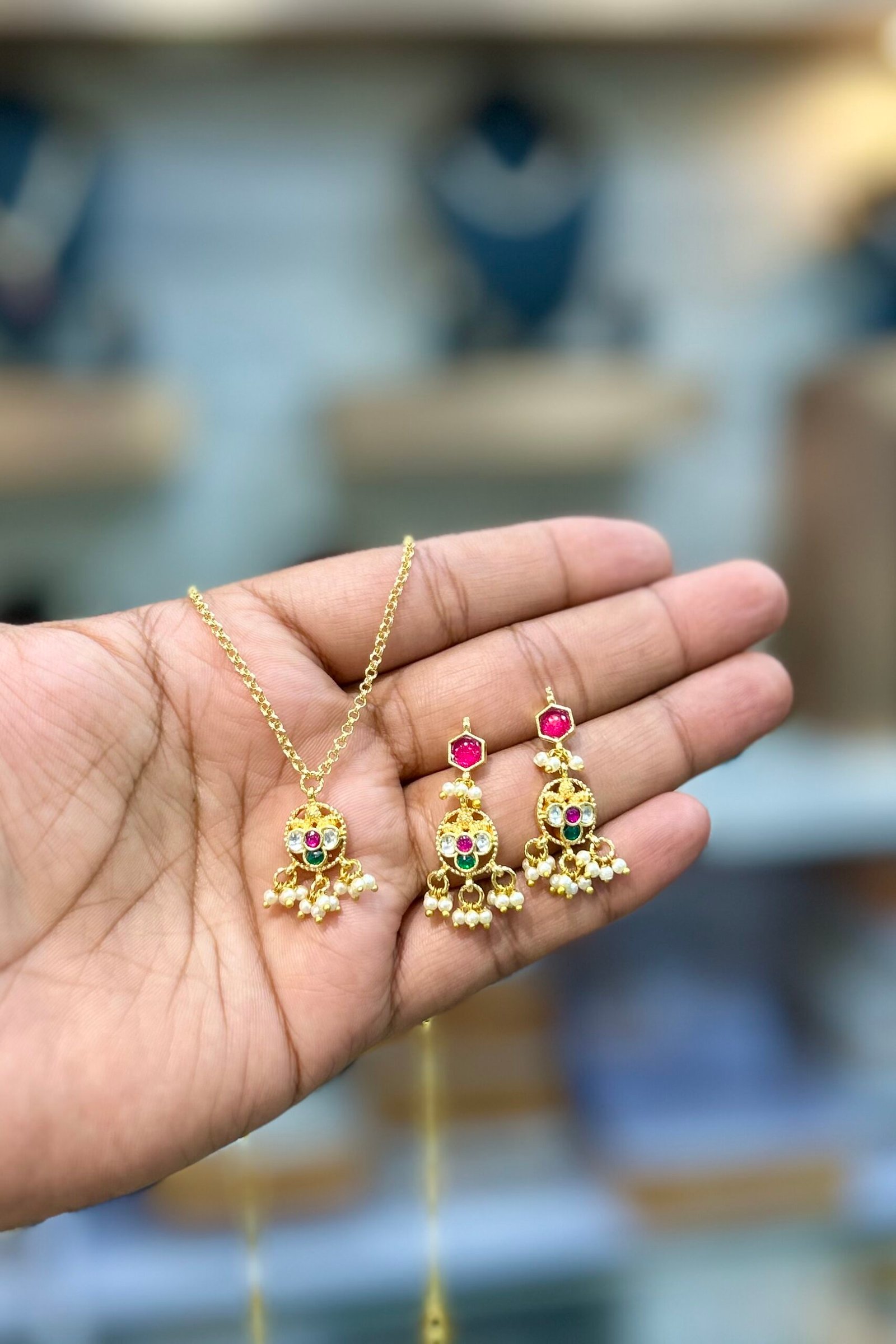 “Elegant and traditional, Pachi Kundan pendant sets feature intricate handcrafted designs adorned with vibrant gemstones and rich enamel work. Perfect for festive occasions and weddings, these sets add a royal charm to any outfit.”