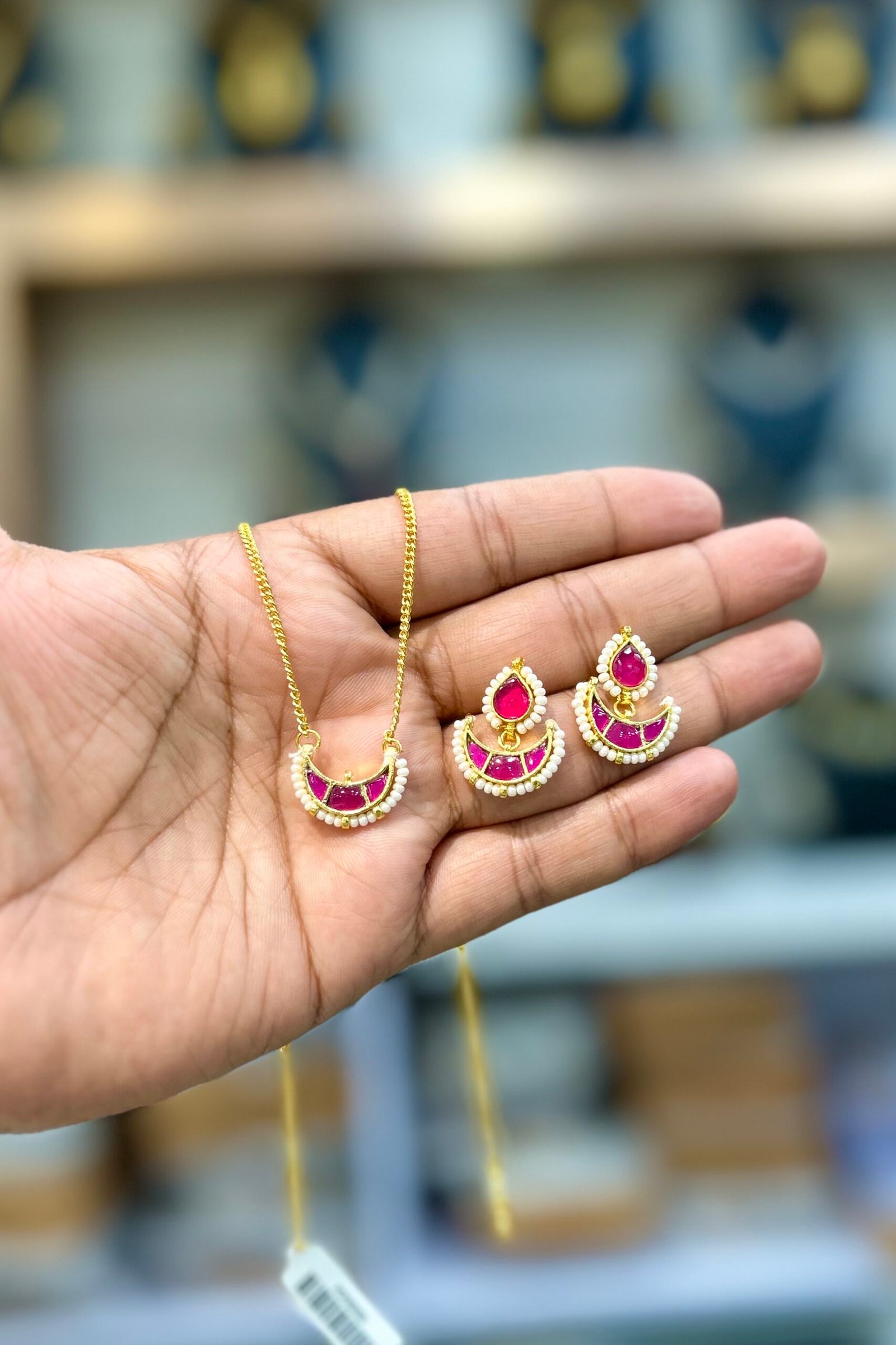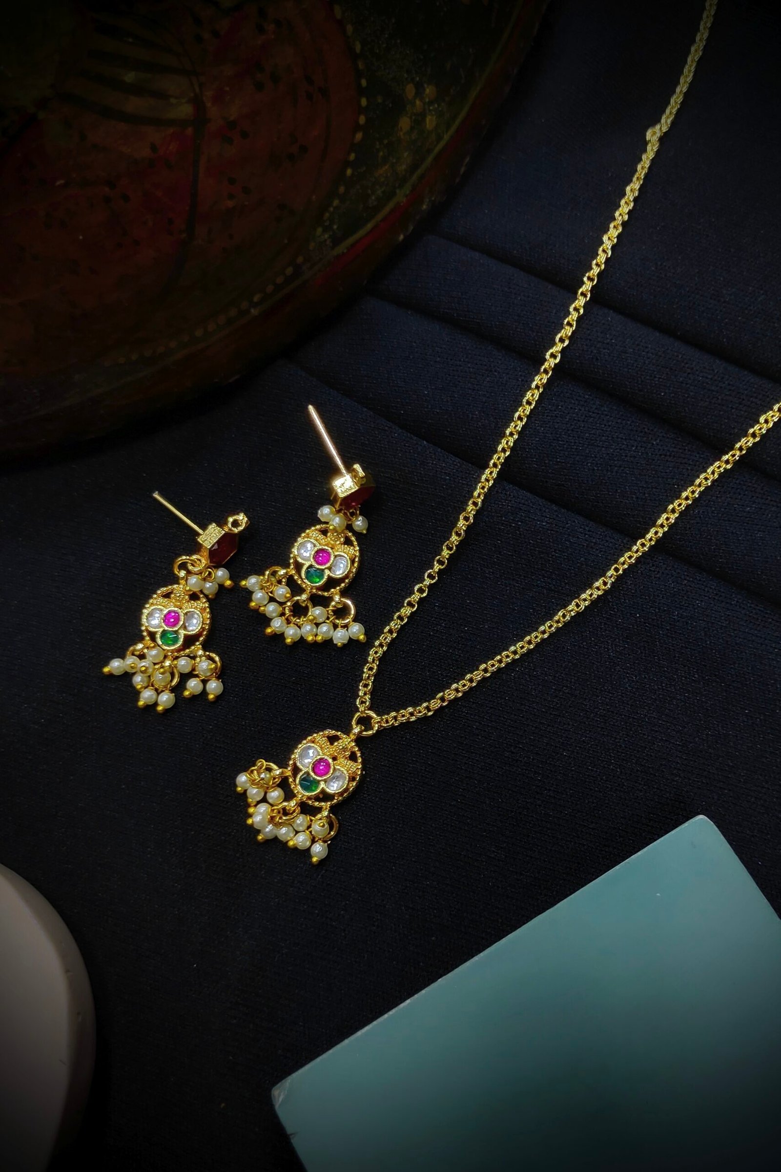 “Elegant and traditional, Pachi Kundan pendant sets feature intricate handcrafted designs adorned with vibrant gemstones and rich enamel work. Perfect for festive occasions and weddings, these sets add a royal charm to any outfit.”