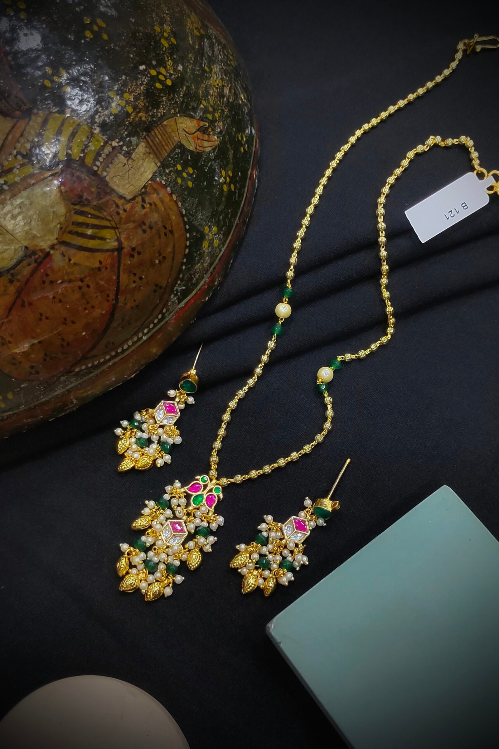“Elegant and traditional, Pachi Kundan pendant sets feature intricate handcrafted designs adorned with vibrant gemstones and rich enamel work. Perfect for festive occasions and weddings, these sets add a royal charm to any outfit.”