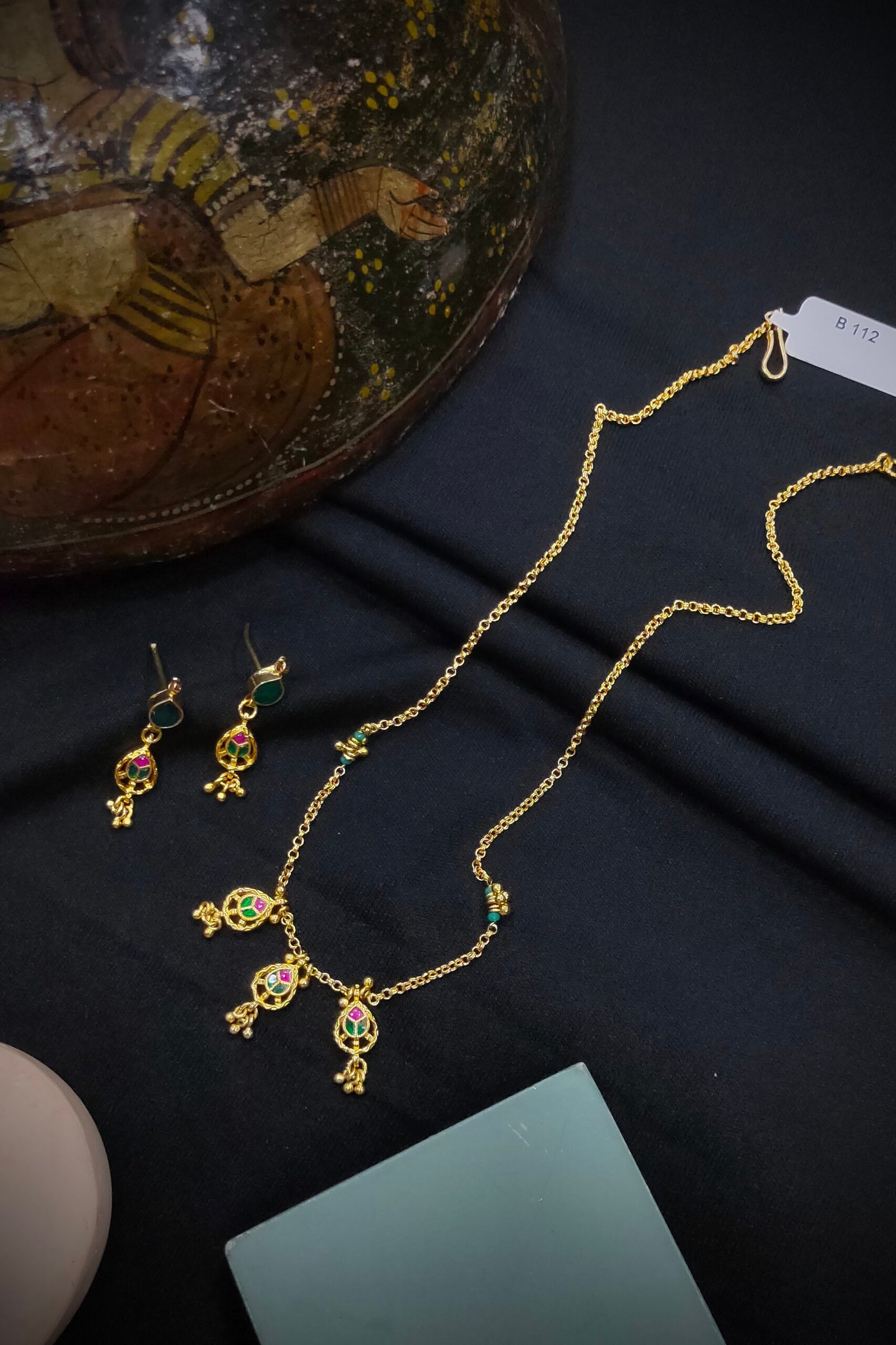 “Elegant and traditional, Pachi Kundan pendant sets feature intricate handcrafted designs adorned with vibrant gemstones and rich enamel work. Perfect for festive occasions and weddings, these sets add a royal charm to any outfit.”