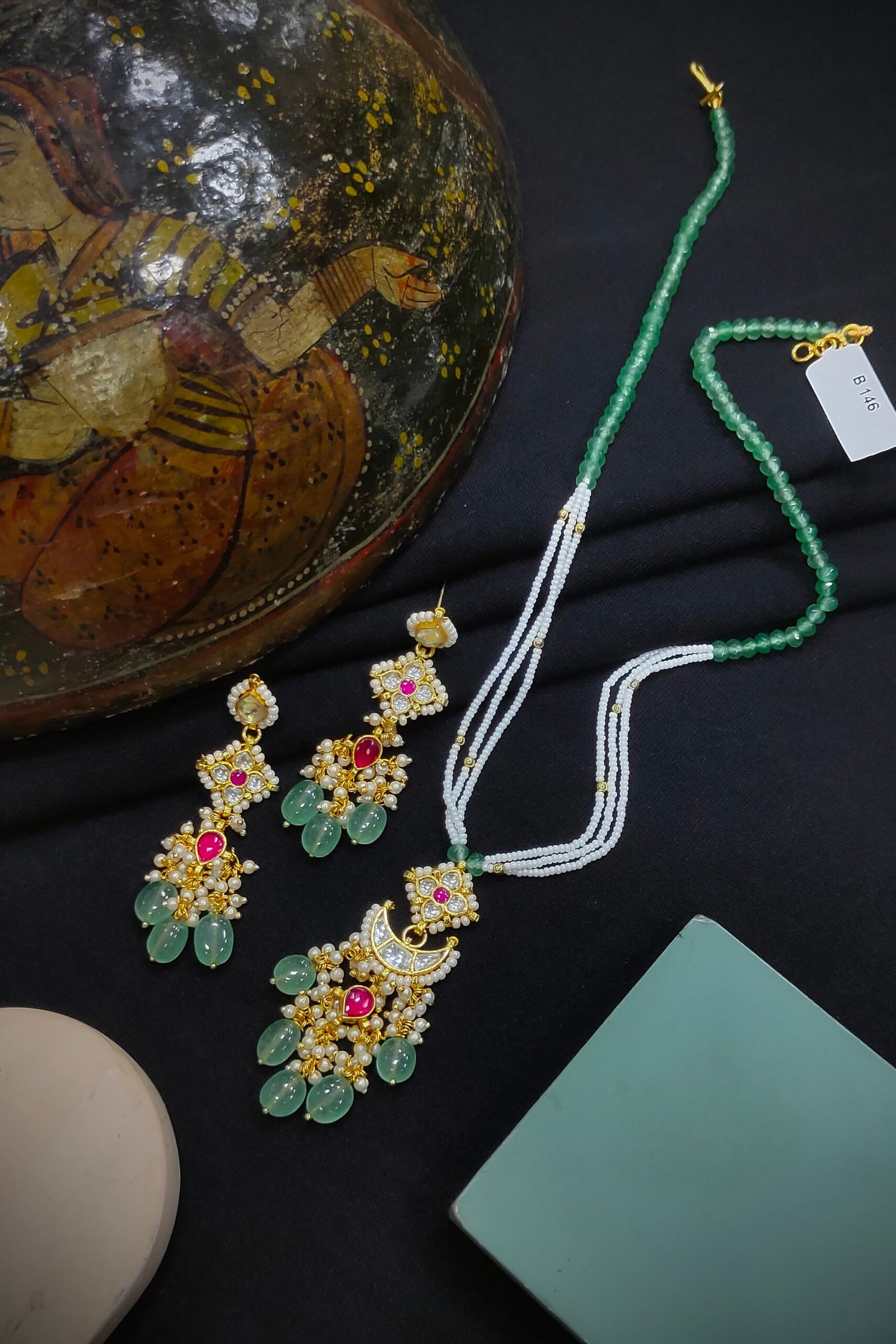 “Elegant and traditional, Pachi Kundan pendant sets feature intricate handcrafted designs adorned with vibrant gemstones and rich enamel work. Perfect for festive occasions and weddings, these sets add a royal charm to any outfit.”