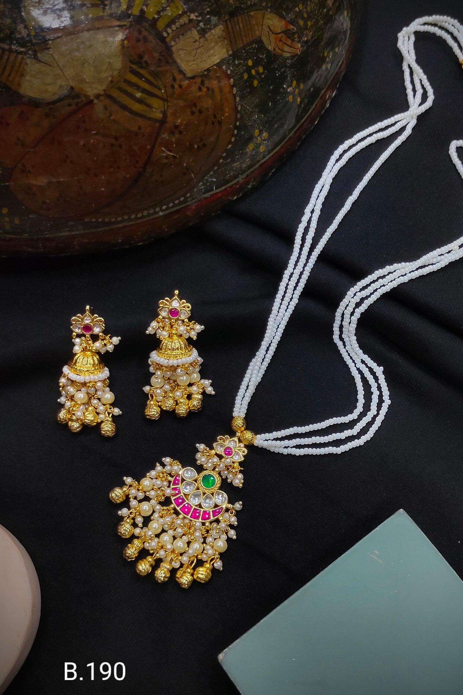 “Elegant and traditional, Pachi Kundan pendant sets feature intricate handcrafted designs adorned with vibrant gemstones and rich enamel work. Perfect for festive occasions and weddings, these sets add a royal charm to any outfit.”