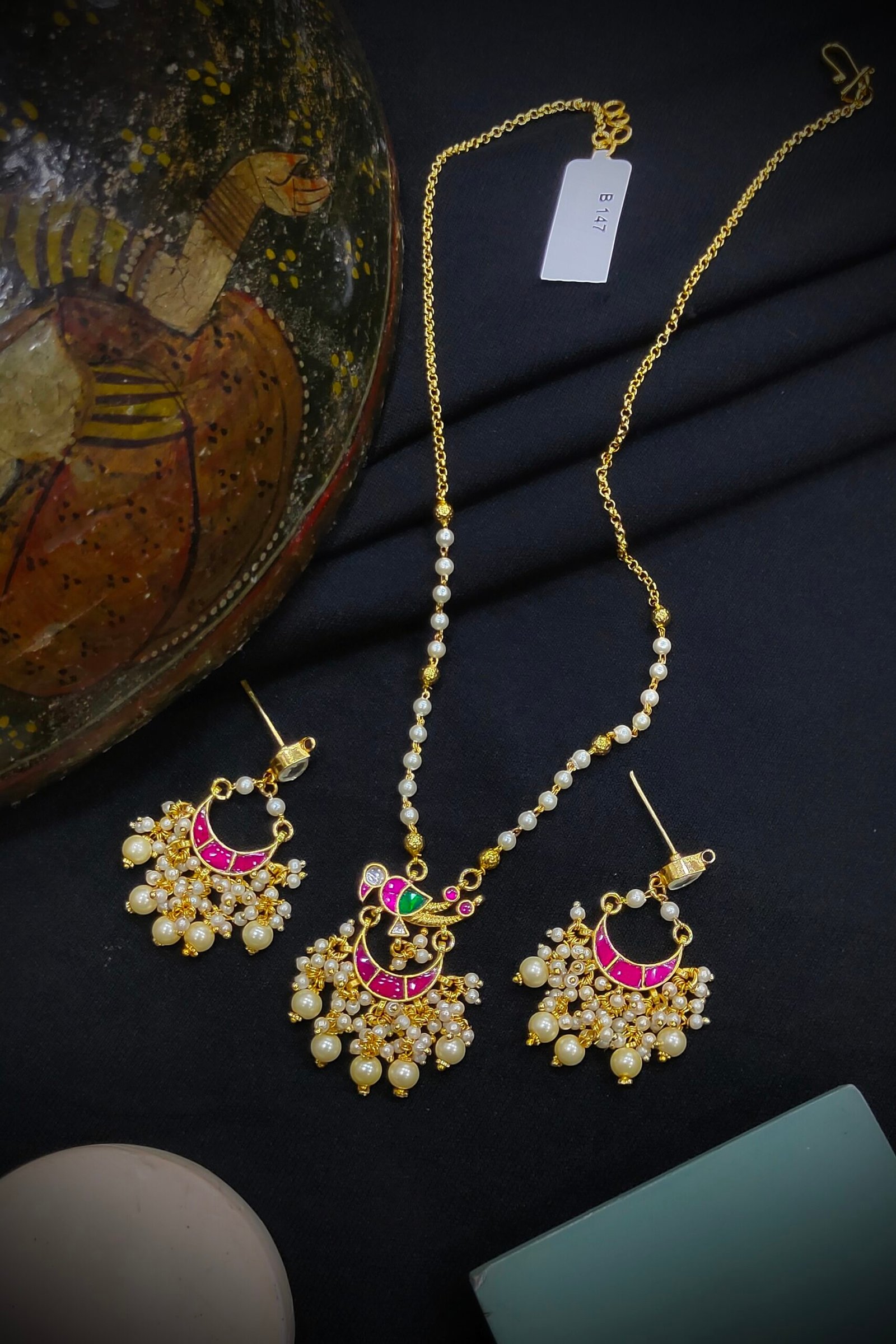 “Elegant and traditional, Pachi Kundan pendant sets feature intricate handcrafted designs adorned with vibrant gemstones and rich enamel work. Perfect for festive occasions and weddings, these sets add a royal charm to any outfit.”