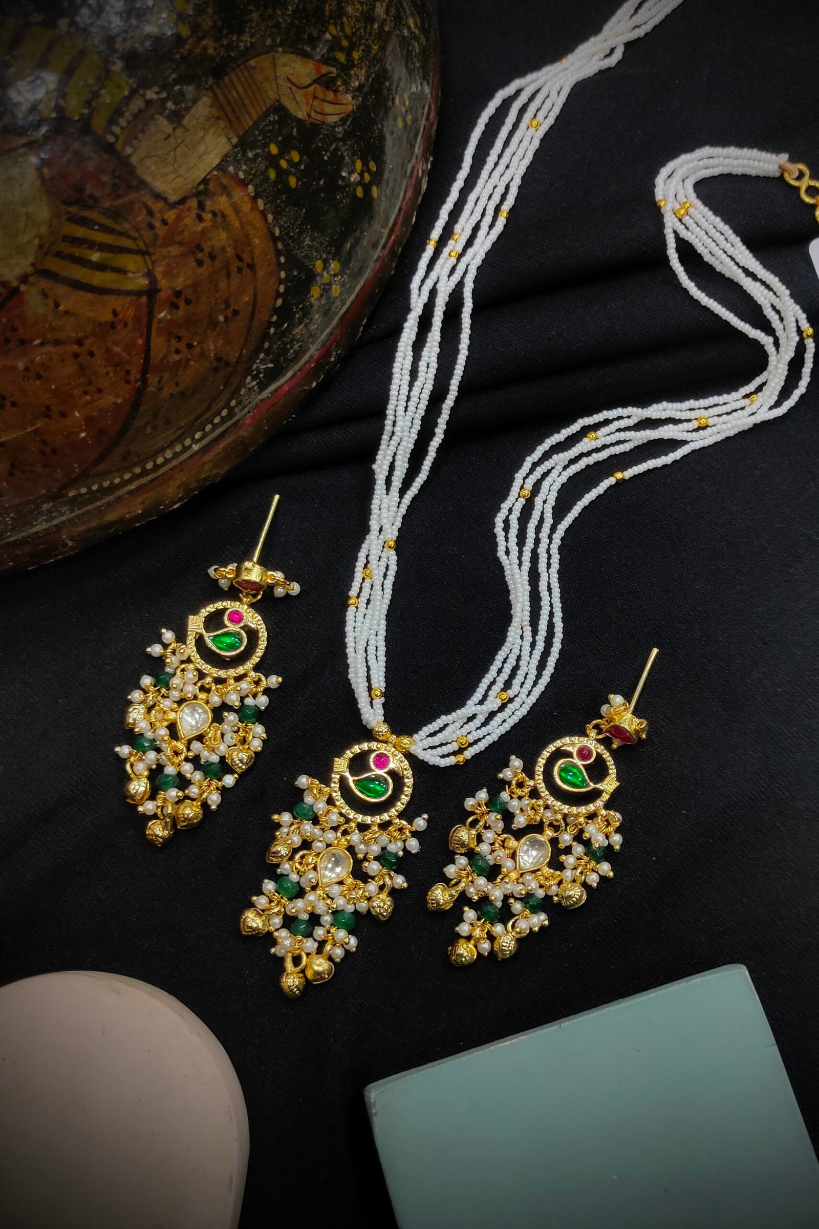 “Elegant and traditional, Pachi Kundan pendant sets feature intricate handcrafted designs adorned with vibrant gemstones and rich enamel work. Perfect for festive occasions and weddings, these sets add a royal charm to any outfit.”