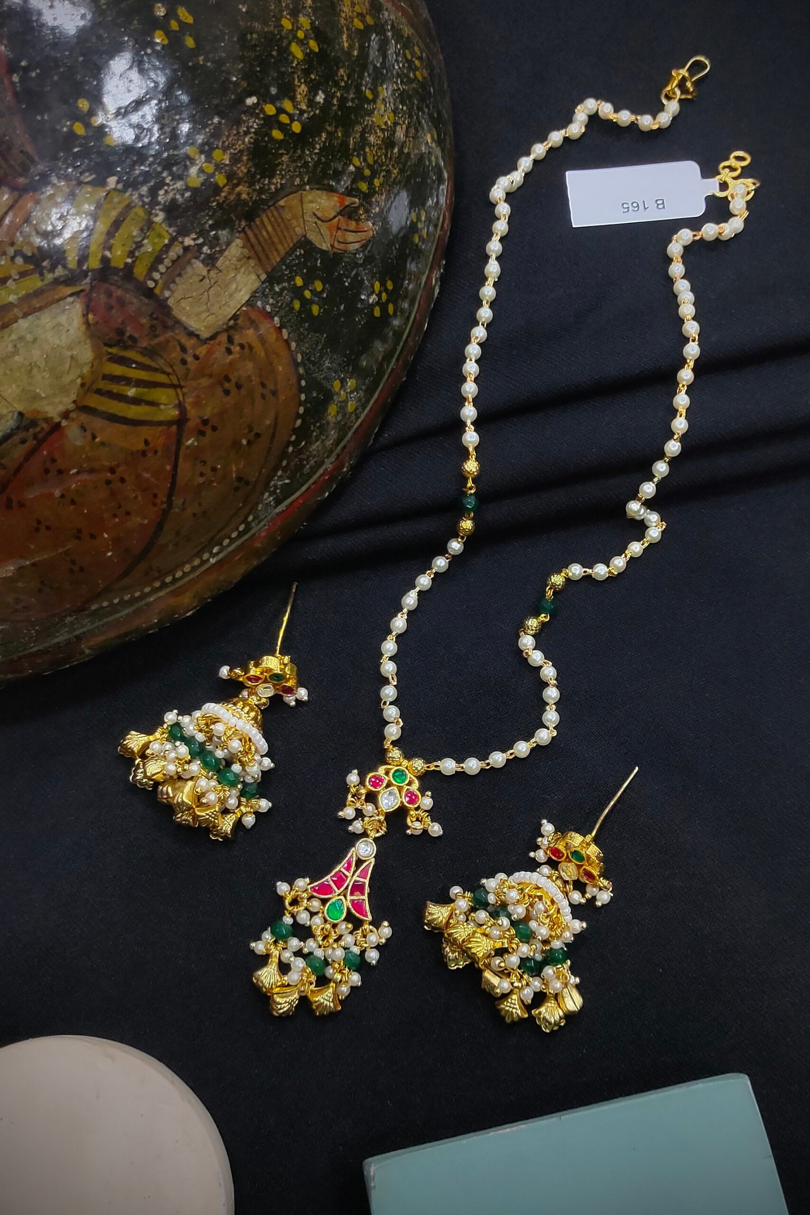 “Elegant and traditional, Pachi Kundan pendant sets feature intricate handcrafted designs adorned with vibrant gemstones and rich enamel work. Perfect for festive occasions and weddings, these sets add a royal charm to any outfit.”