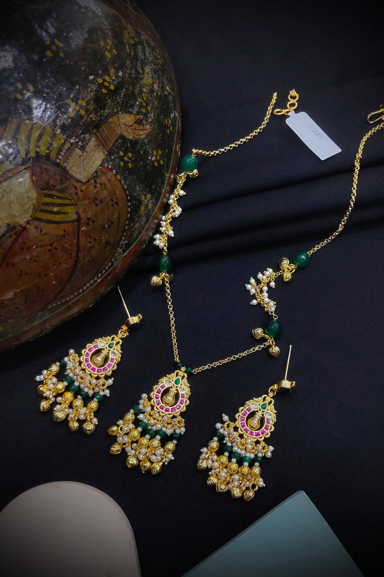 “Elegant and traditional, Pachi Kundan pendant sets feature intricate handcrafted designs adorned with vibrant gemstones and rich enamel work. Perfect for festive occasions and weddings, these sets add a royal charm to any outfit.”
