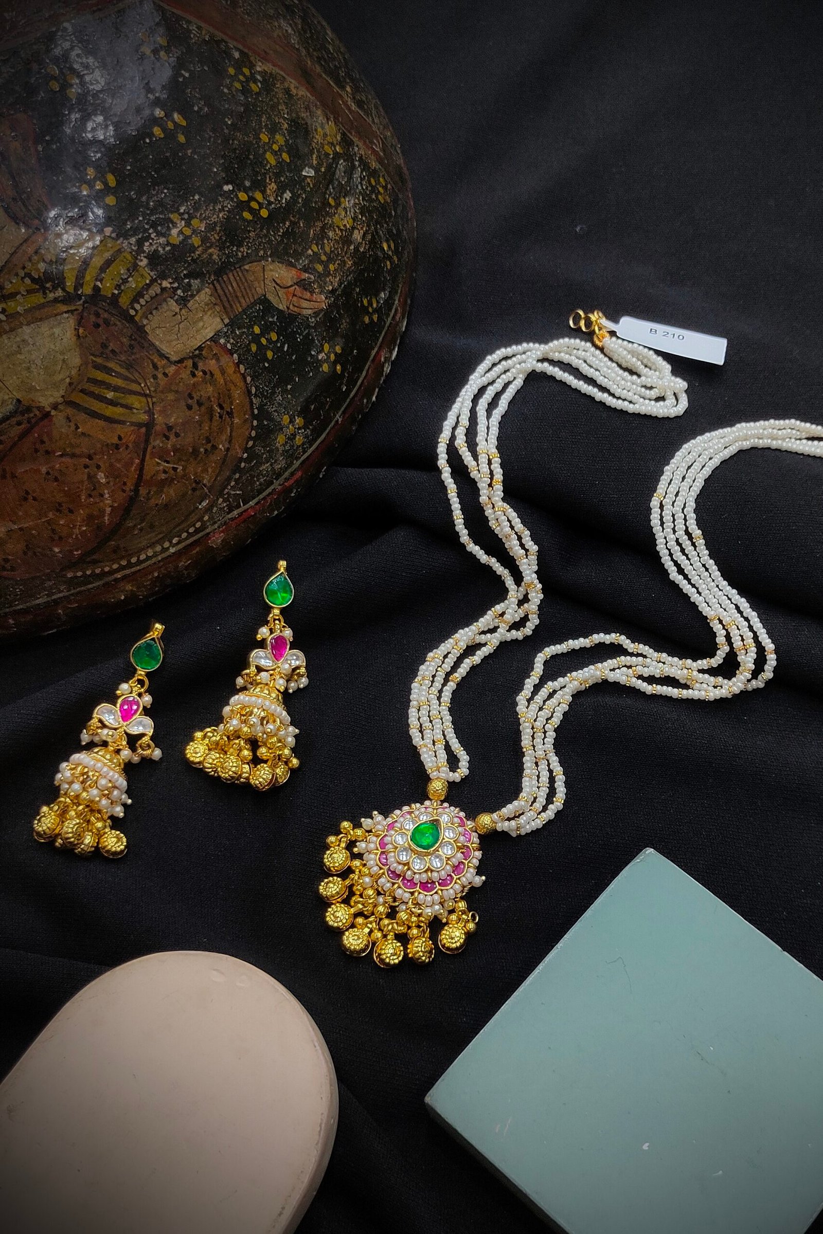 “Elegant and traditional, Pachi Kundan pendant sets feature intricate handcrafted designs adorned with vibrant gemstones and rich enamel work. Perfect for festive occasions and weddings, these sets add a royal charm to any outfit.”
