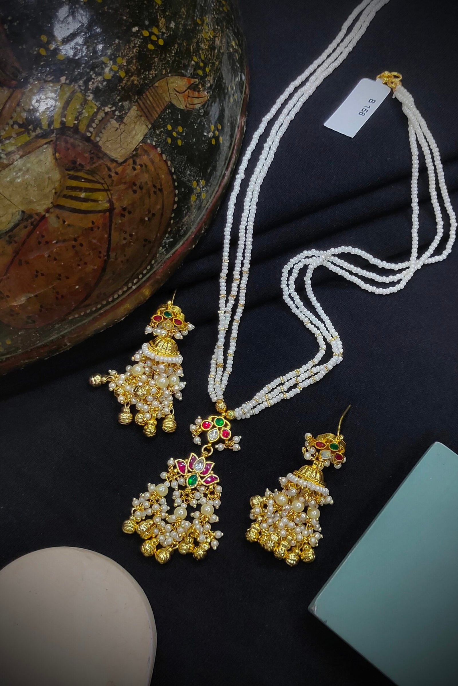 “Elegant and traditional, Pachi Kundan pendant sets feature intricate handcrafted designs adorned with vibrant gemstones and rich enamel work. Perfect for festive occasions and weddings, these sets add a royal charm to any outfit.”
