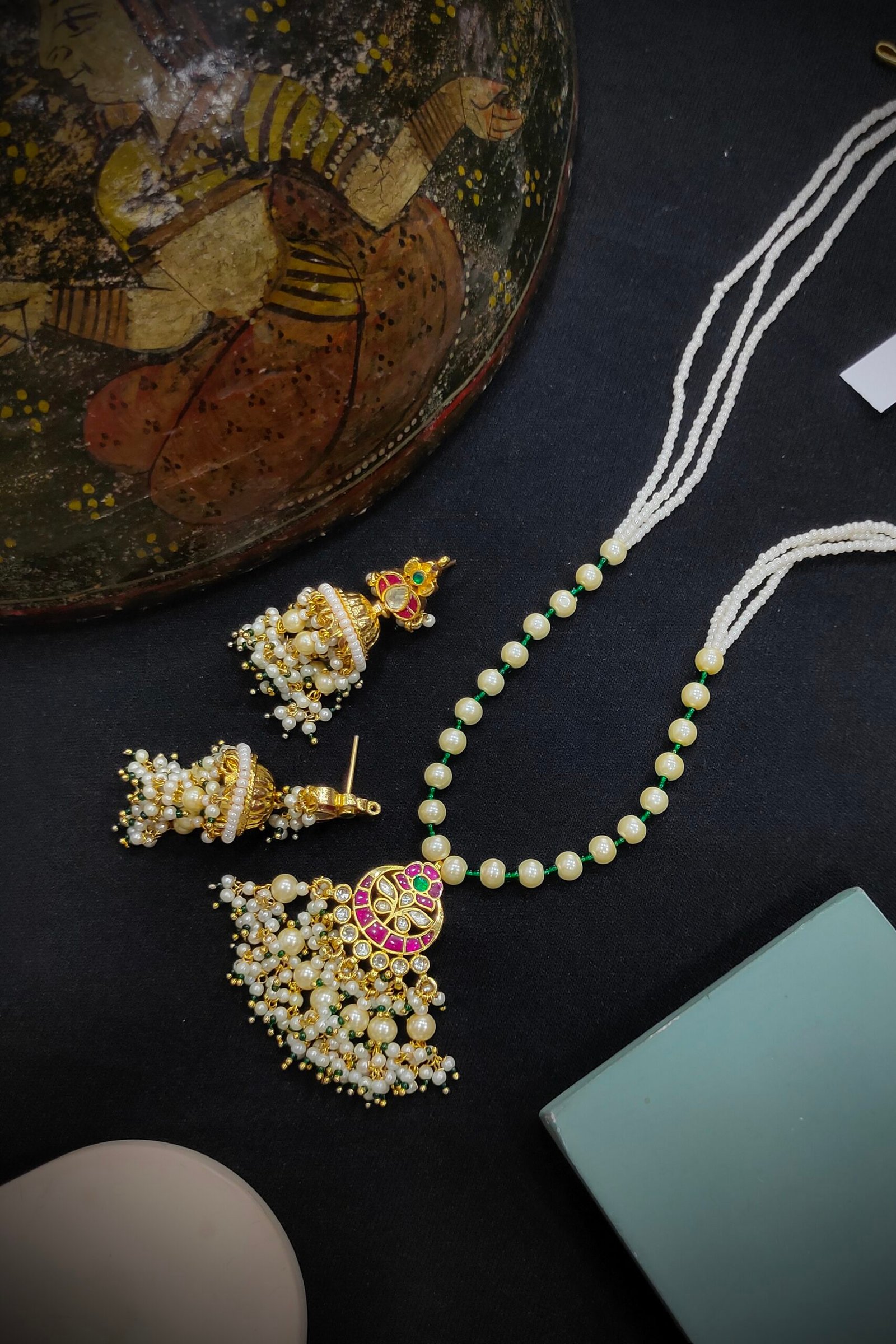 “Elegant and traditional, Pachi Kundan pendant sets feature intricate handcrafted designs adorned with vibrant gemstones and rich enamel work. Perfect for festive occasions and weddings, these sets add a royal charm to any outfit.”
