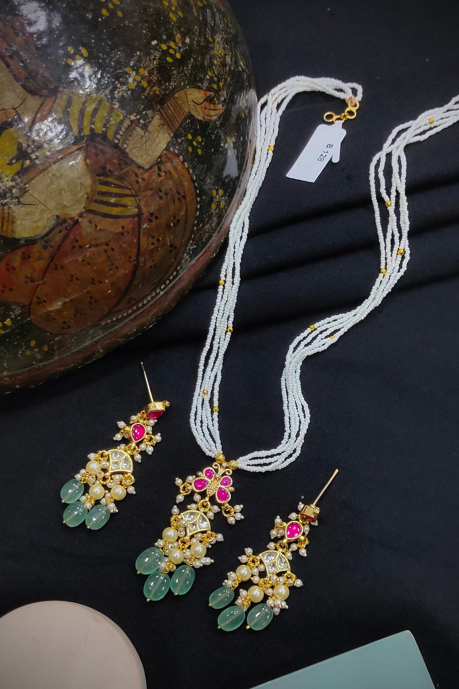 “Elegant and traditional, Pachi Kundan pendant sets feature intricate handcrafted designs adorned with vibrant gemstones and rich enamel work. Perfect for festive occasions and weddings, these sets add a royal charm to any outfit.”