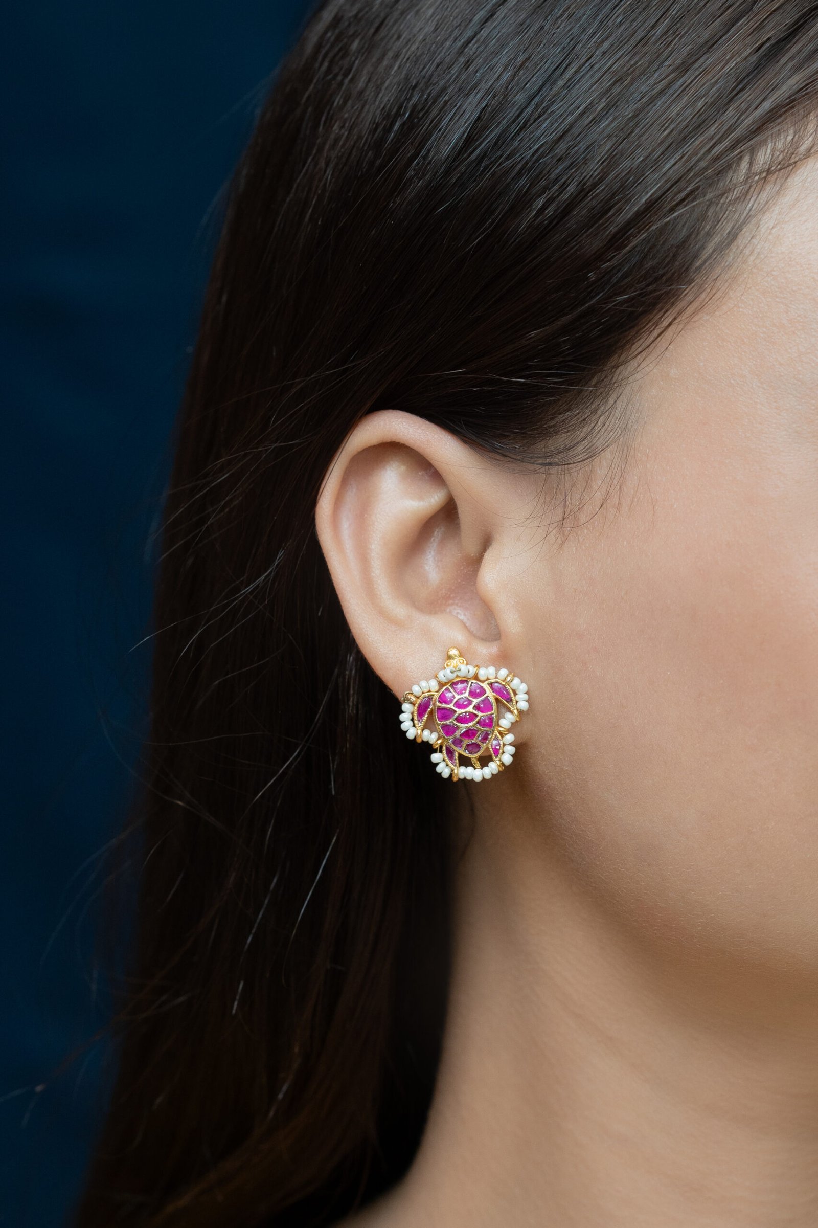 Pachi Kundan earring tops are elegant, traditional earrings that highlight the unique pachi style of kundan work. Unlike polished or finely cut stones, pachi kundan uses raw, uncut, or roughly shaped gemstones, which give a rustic and authentic appeal. The stones are set in gold or gold-plated metal, typically in floral or abstract patterns, creating a classic yet earthy look.