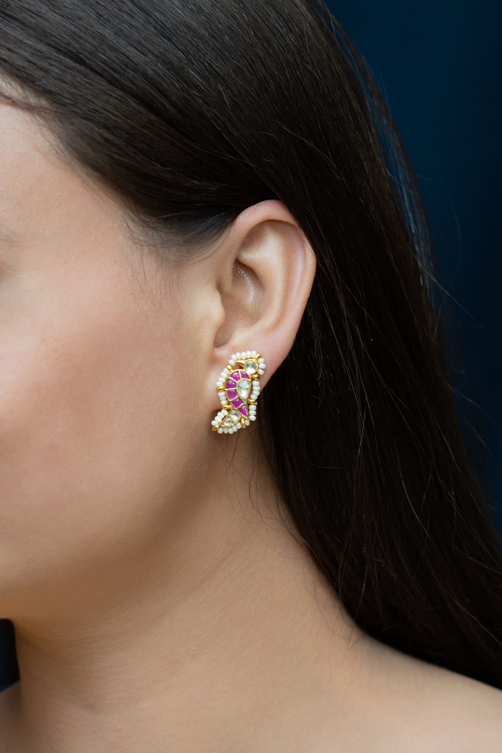 These earring tops are often stud-style, designed to sit closely against the earlobe, though some styles may incorporate a small drop or dangle for added flair. They are commonly embellished with pearls, beads, and sometimes additional mirror or enamel detailing, making them ideal for festive occasions, weddings, and traditional gatherings. The combination of unpolished stones and intricate craftsmanship gives them a distinct, handmade look that reflects traditional Indian artistry.