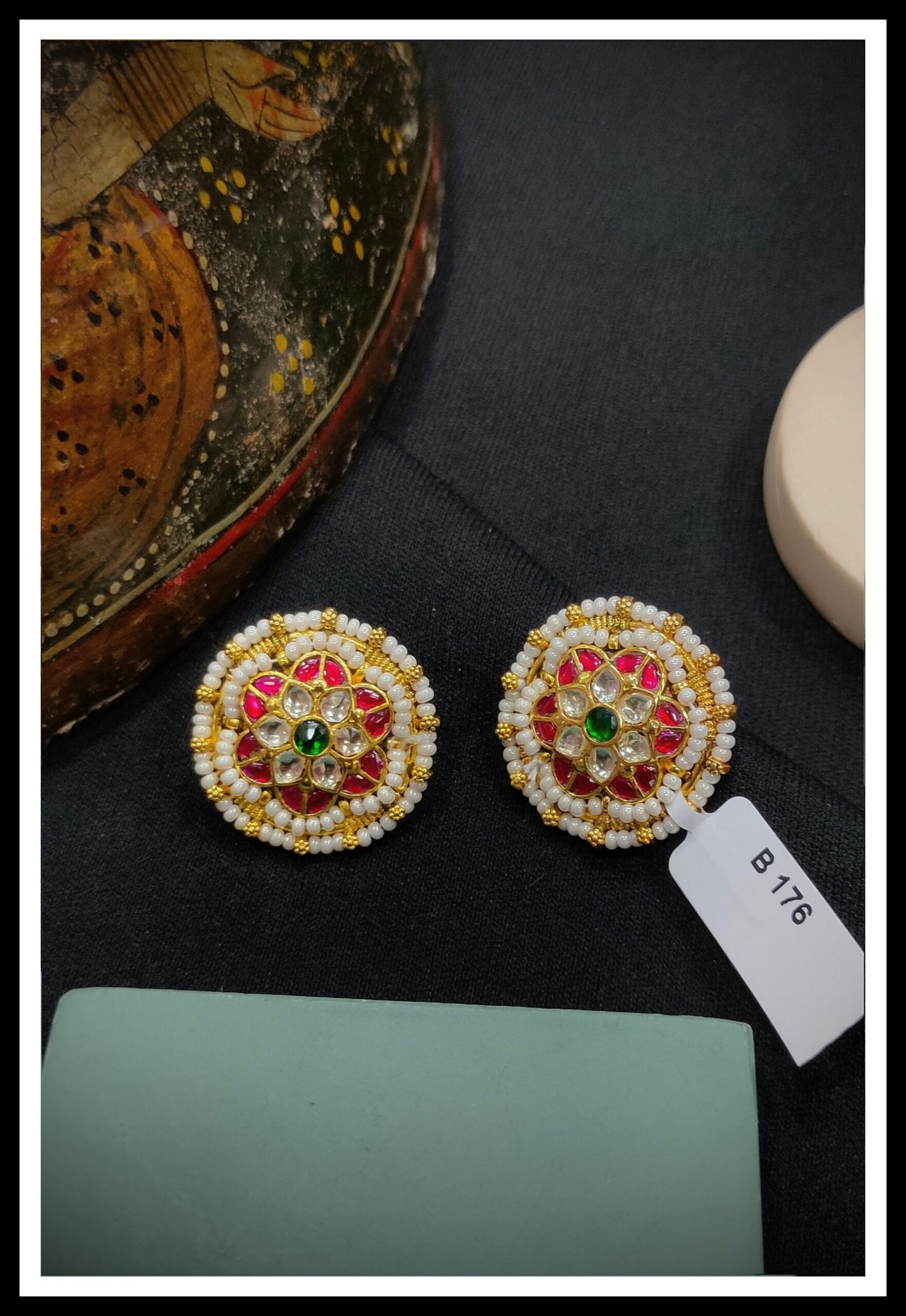 Pachi Kundan earring tops are elegant, traditional earrings that highlight the unique pachi style of kundan work. Unlike polished or finely cut stones, pachi kundan uses raw, uncut, or roughly shaped gemstones, which give a rustic and authentic appeal. The stones are set in gold or gold-plated metal, typically in floral or abstract patterns, creating a classic yet earthy look.