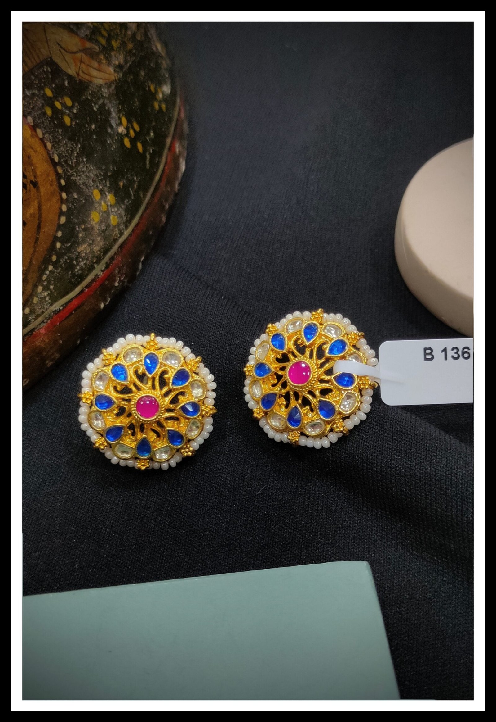 Pachi Kundan earring tops are elegant, traditional earrings that highlight the unique pachi style of kundan work. Unlike polished or finely cut stones, pachi kundan uses raw, uncut, or roughly shaped gemstones, which give a rustic and authentic appeal. The stones are set in gold or gold-plated metal, typically in floral or abstract patterns, creating a classic yet earthy look.