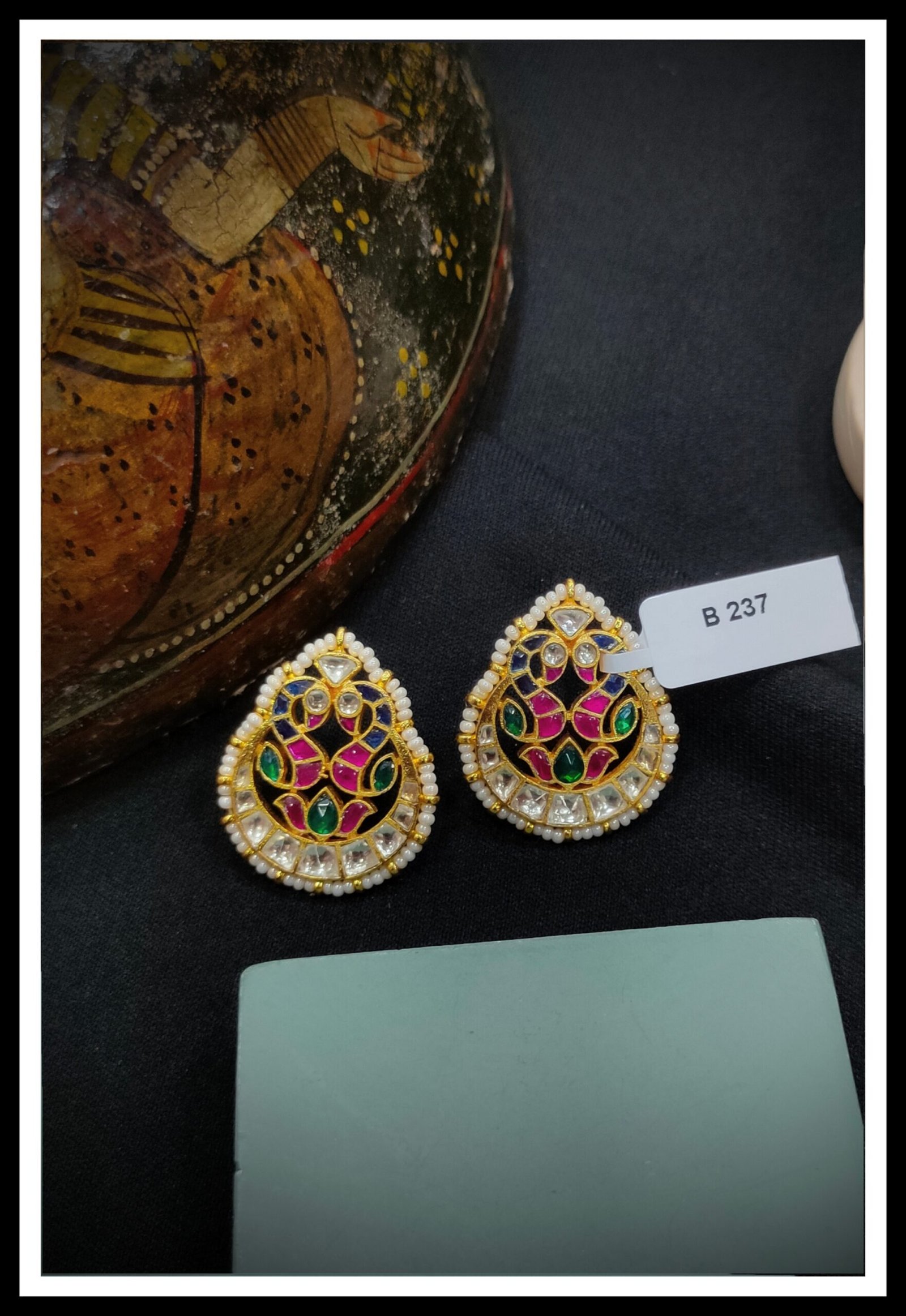 Pachi Kundan earring tops are elegant, traditional earrings that highlight the unique pachi style of kundan work. Unlike polished or finely cut stones, pachi kundan uses raw, uncut, or roughly shaped gemstones, which give a rustic and authentic appeal. The stones are set in gold or gold-plated metal, typically in floral or abstract patterns, creating a classic yet earthy look.