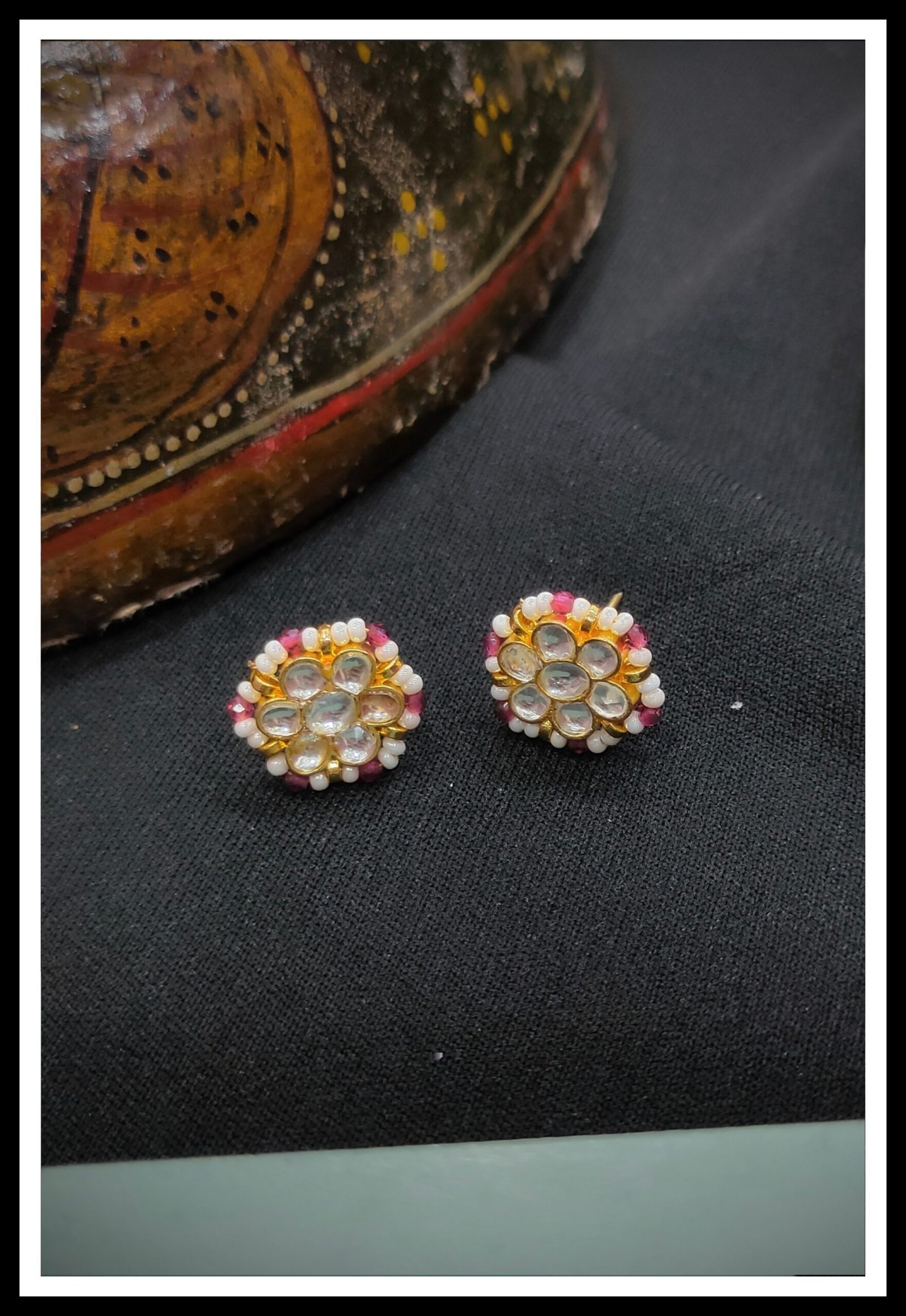 These earring tops are often stud-style, designed to sit closely against the earlobe, though some styles may incorporate a small drop or dangle for added flair. They are commonly embellished with pearls, beads, and sometimes additional mirror or enamel detailing, making them ideal for festive occasions, weddings, and traditional gatherings. The combination of unpolished stones and intricate craftsmanship gives them a distinct, handmade look that reflects traditional Indian artistry.