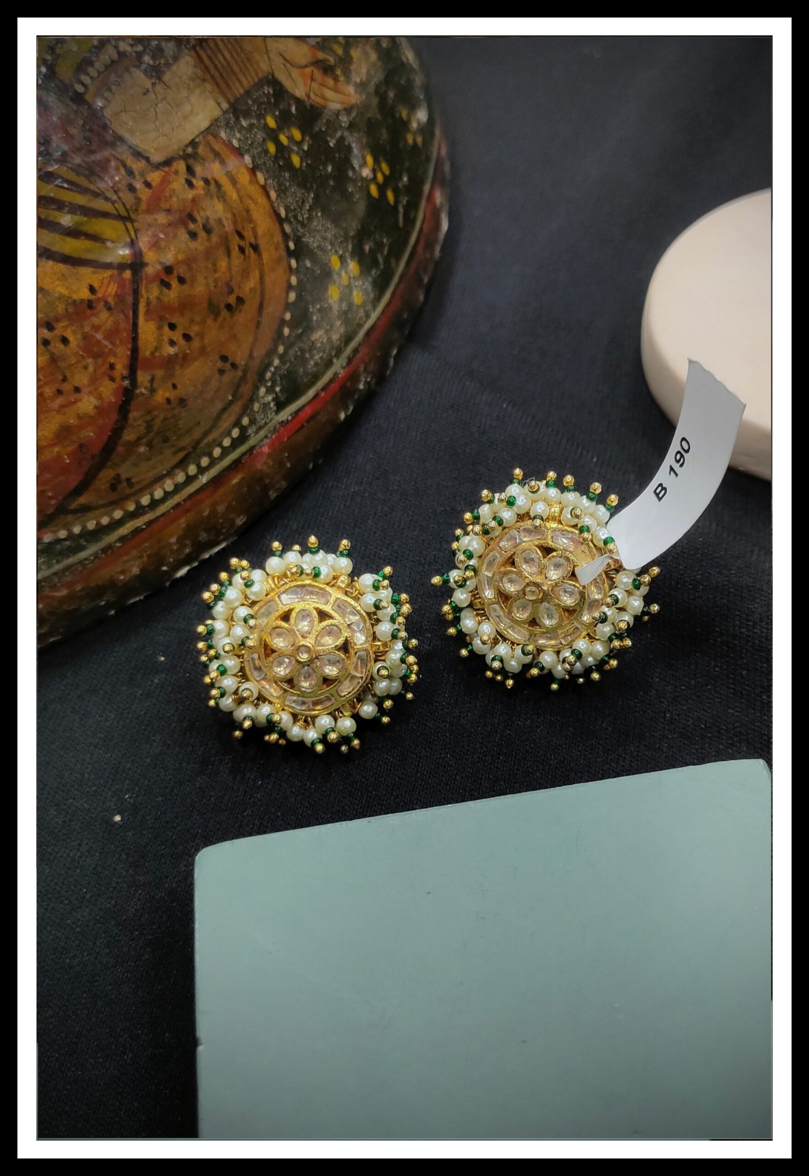 Pachi Kundan earring tops are elegant, traditional earrings that highlight the unique pachi style of kundan work. Unlike polished or finely cut stones, pachi kundan uses raw, uncut, or roughly shaped gemstones, which give a rustic and authentic appeal. The stones are set in gold or gold-plated metal, typically in floral or abstract patterns, creating a classic yet earthy look.