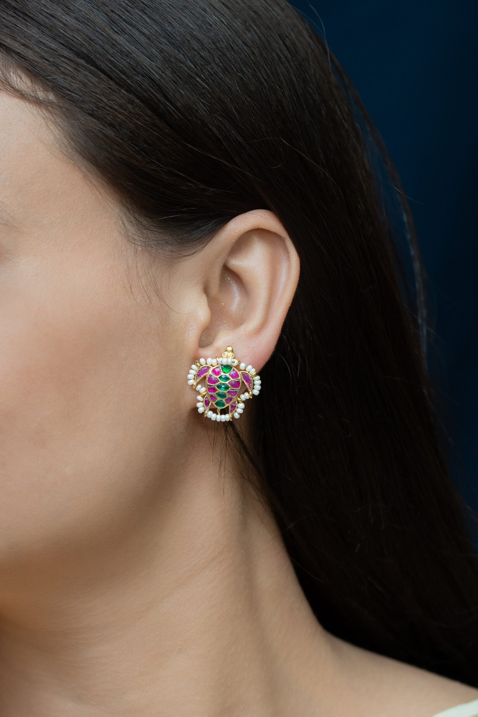 Pachi Kundan earring tops are elegant, traditional earrings that highlight the unique pachi style of kundan work. Unlike polished or finely cut stones, pachi kundan uses raw, uncut, or roughly shaped gemstones, which give a rustic and authentic appeal. The stones are set in gold or gold-plated metal, typically in floral or abstract patterns, creating a classic yet earthy look.