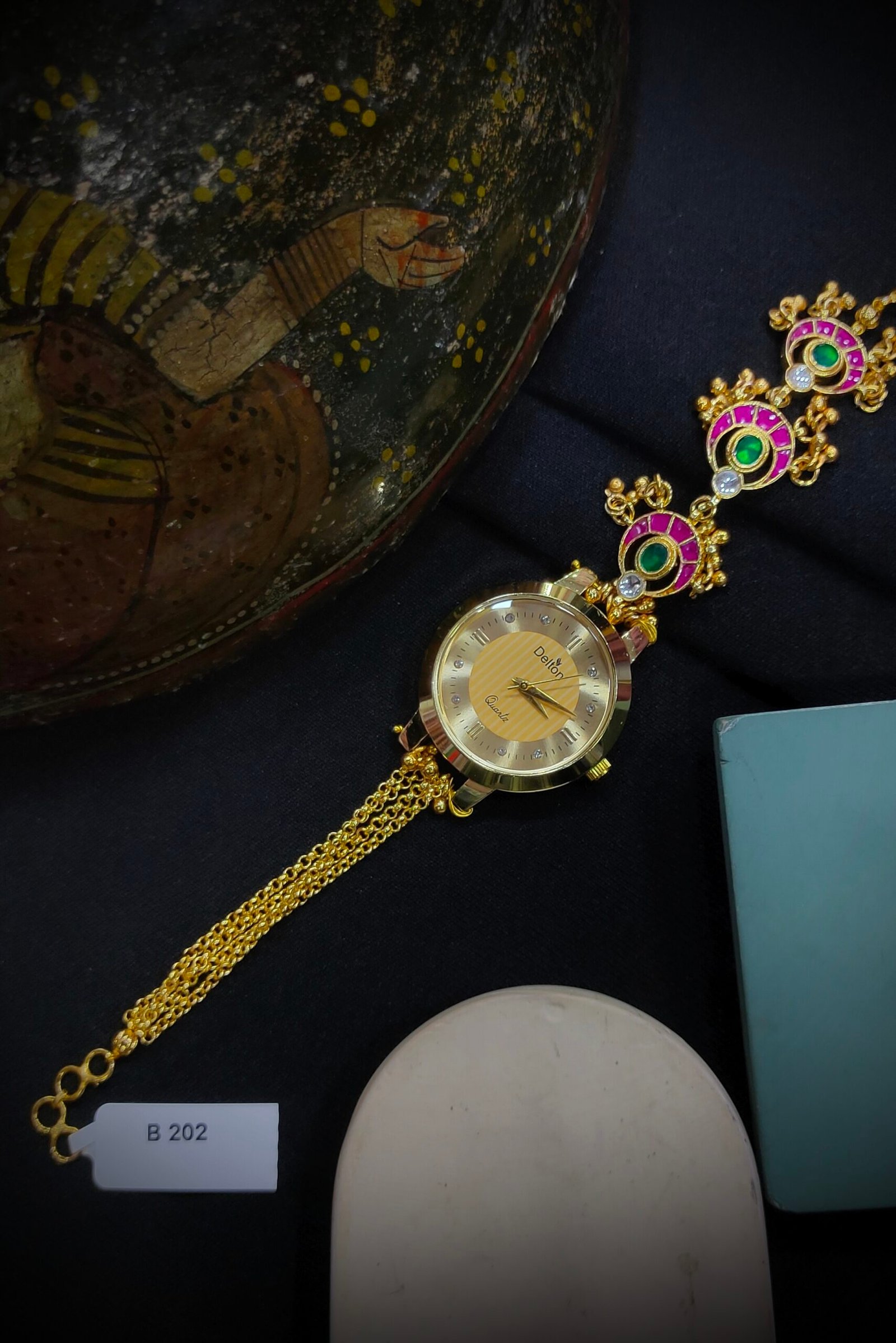 A Pachi Kundan watch typically features intricate designs that combine traditional Indian jewelry aesthetics with the functionality of a timepiece. It is adorned with Kundan stones—crafted from gold foil and set in intricate patterns—often accompanied by colorful gemstones or pearls. The watch may have a vintage or regal look, highlighting craftsmanship with a delicate, ornate bracelet or strap. Ideal for festive occasions or weddings, this watch blends elegance and cultural heritage.