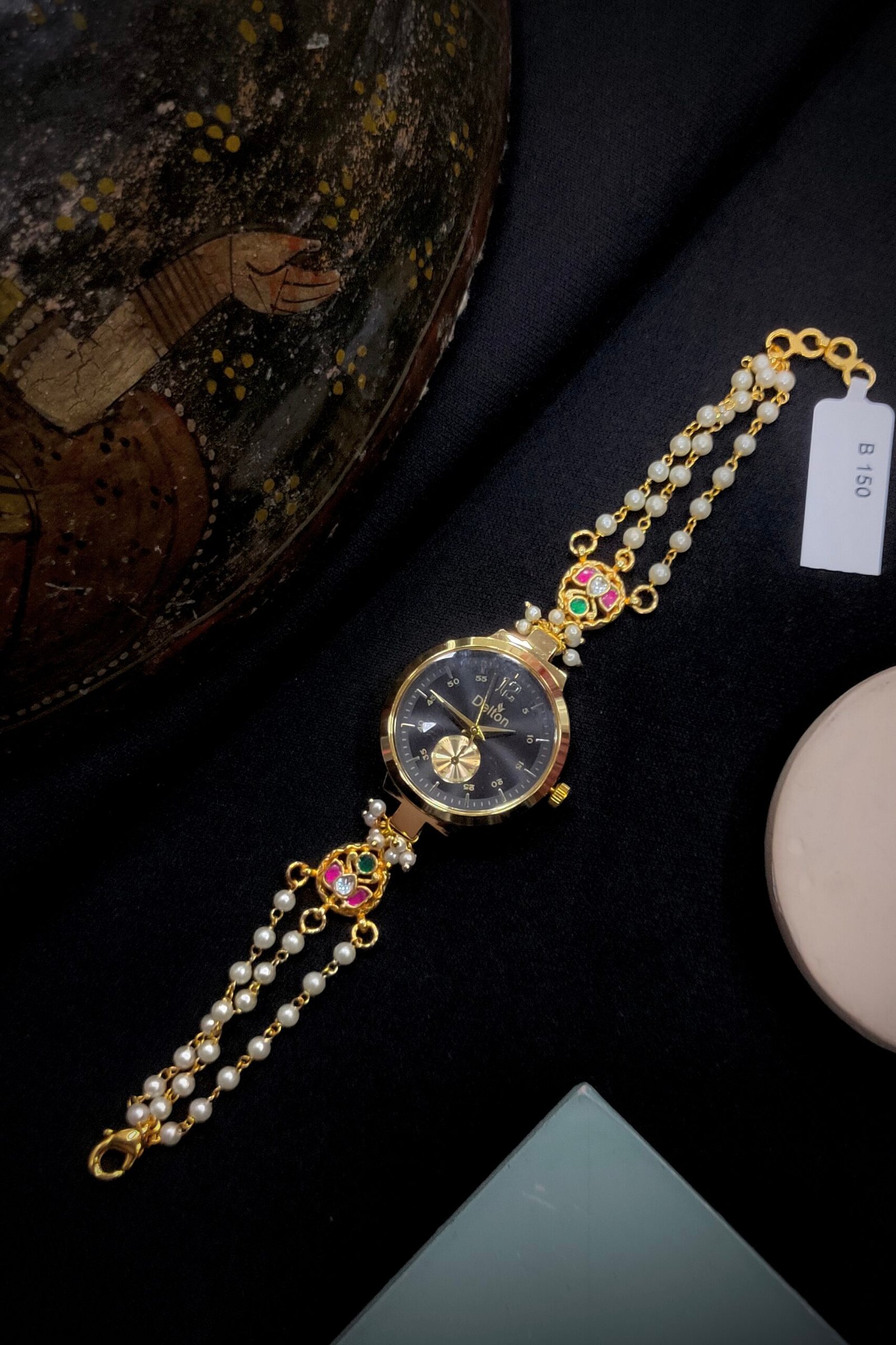 A Pachi Kundan watch typically features intricate designs that combine traditional Indian jewelry aesthetics with the functionality of a timepiece. It is adorned with Kundan stones—crafted from gold foil and set in intricate patterns—often accompanied by colorful gemstones or pearls. The watch may have a vintage or regal look, highlighting craftsmanship with a delicate, ornate bracelet or strap. Ideal for festive occasions or weddings, this watch blends elegance and cultural heritage.