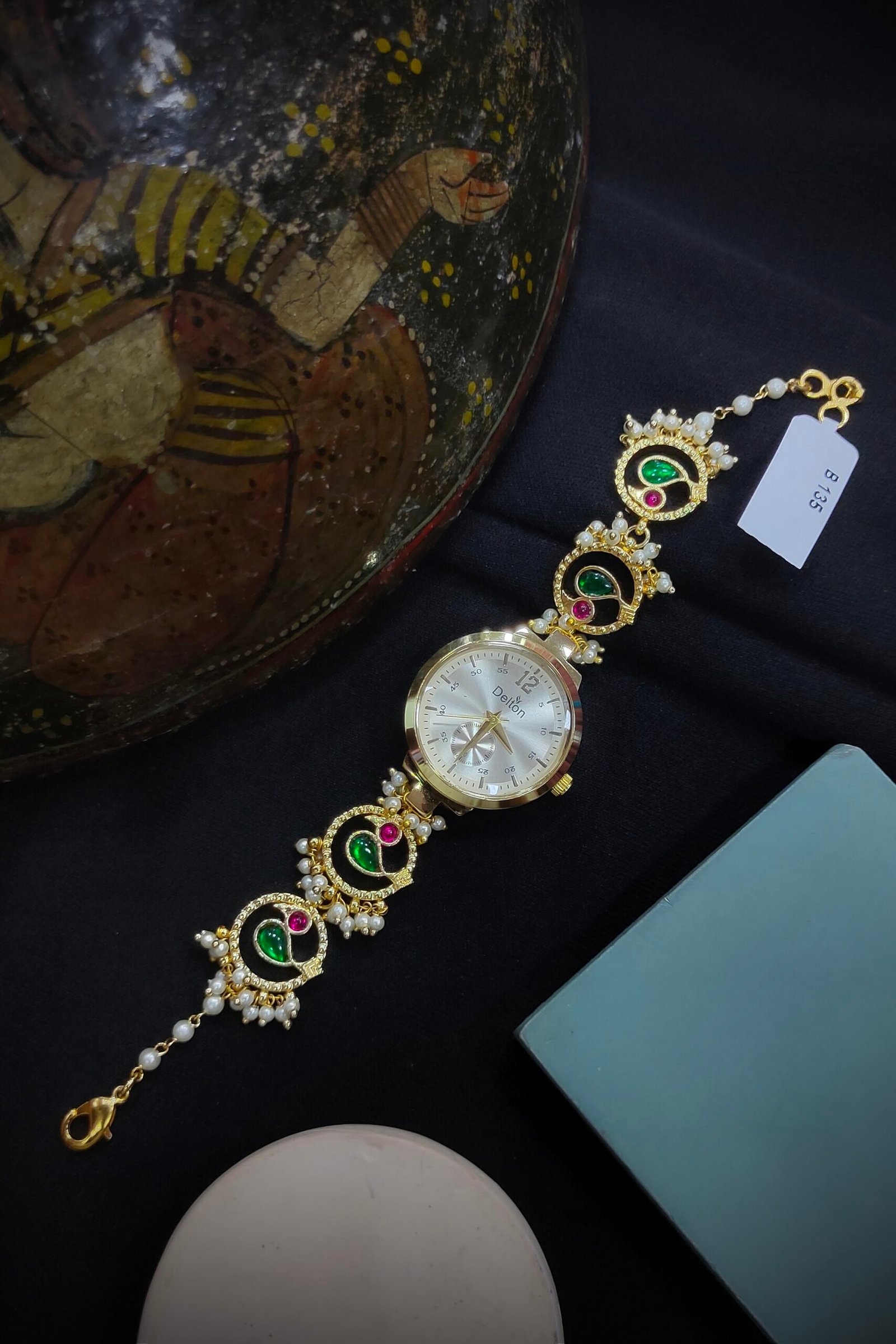 A Pachi Kundan watch typically features intricate designs that combine traditional Indian jewelry aesthetics with the functionality of a timepiece. It is adorned with Kundan stones—crafted from gold foil and set in intricate patterns—often accompanied by colorful gemstones or pearls. The watch may have a vintage or regal look, highlighting craftsmanship with a delicate, ornate bracelet or strap. Ideal for festive occasions or weddings, this watch blends elegance and cultural heritage.