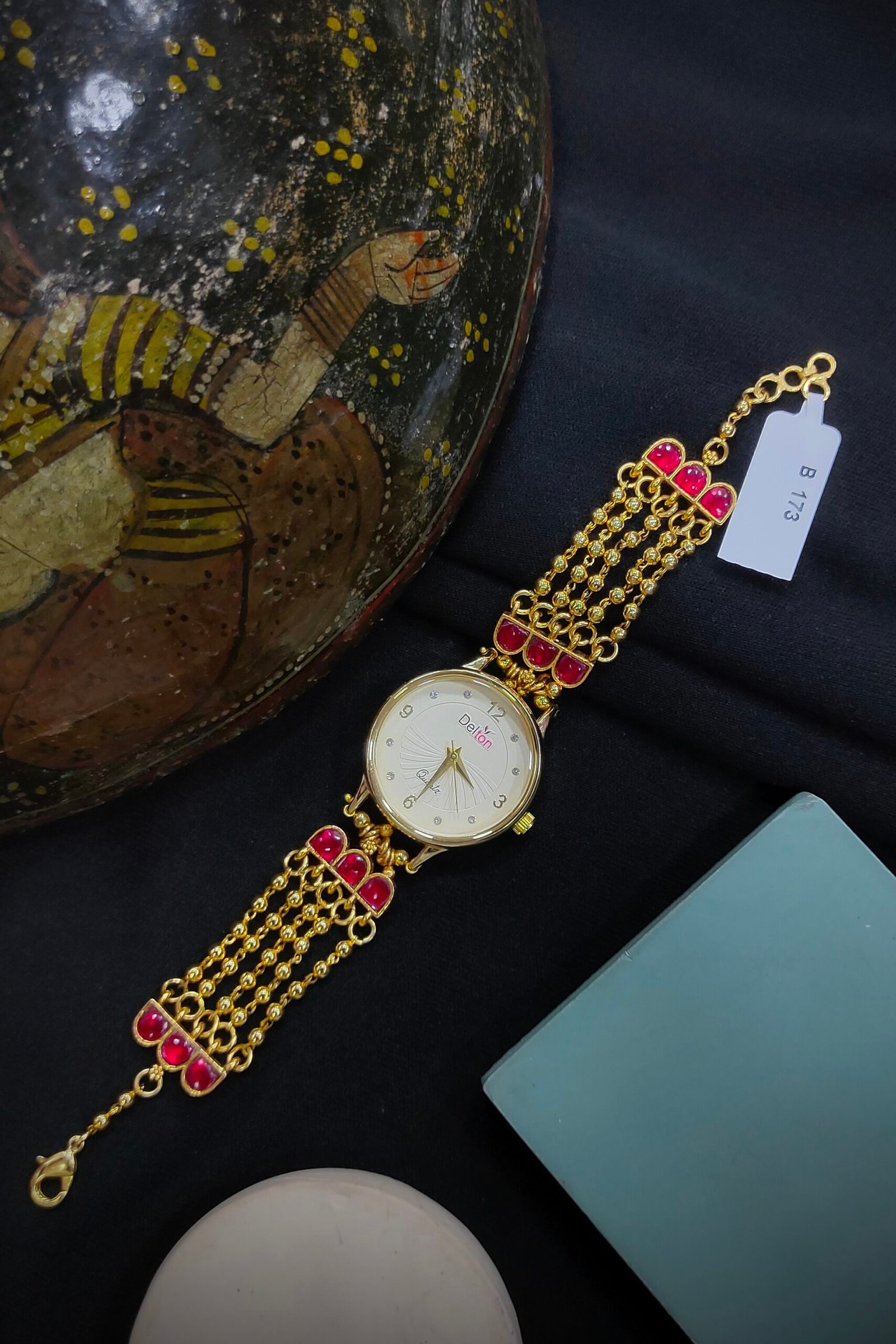 A Pachi Kundan watch typically features intricate designs that combine traditional Indian jewelry aesthetics with the functionality of a timepiece. It is adorned with Kundan stones—crafted from gold foil and set in intricate patterns—often accompanied by colorful gemstones or pearls. The watch may have a vintage or regal look, highlighting craftsmanship with a delicate, ornate bracelet or strap. Ideal for festive occasions or weddings, this watch blends elegance and cultural heritage.