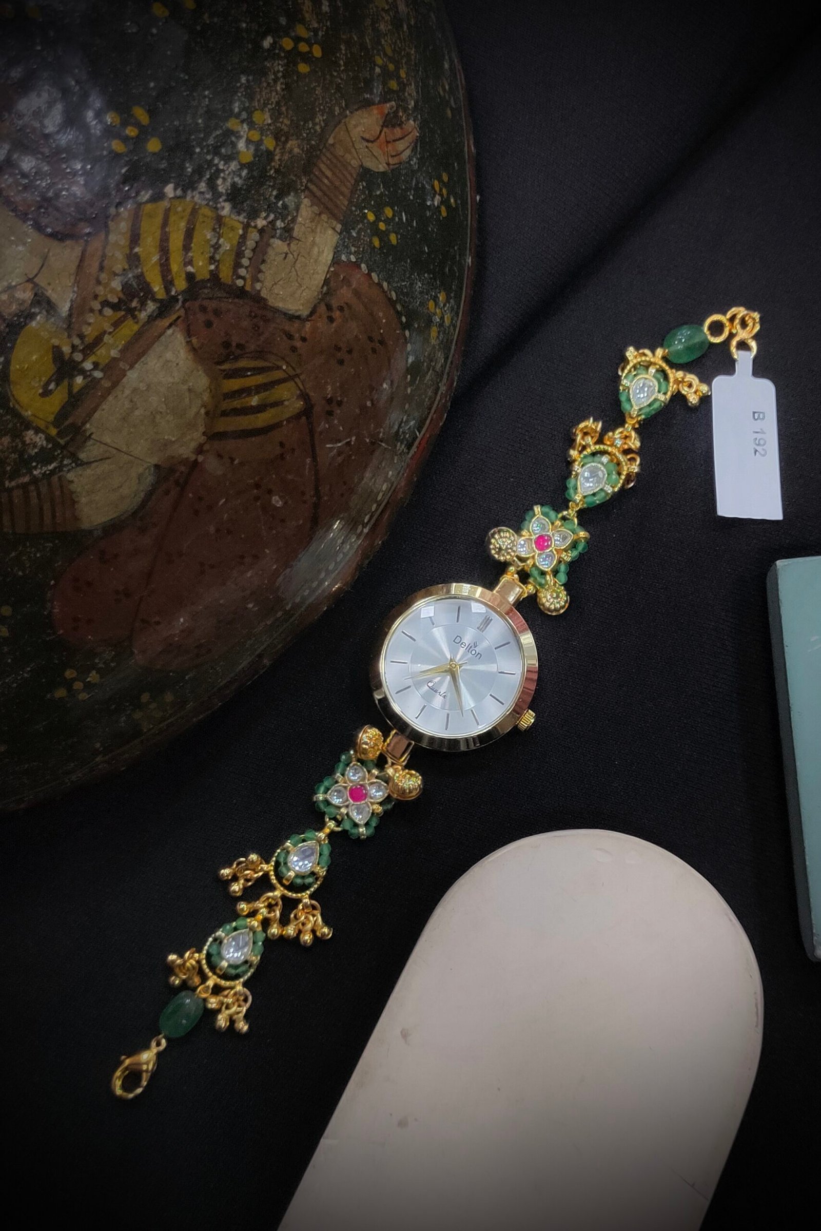 A Pachi Kundan watch typically features intricate designs that combine traditional Indian jewelry aesthetics with the functionality of a timepiece. It is adorned with Kundan stones—crafted from gold foil and set in intricate patterns—often accompanied by colorful gemstones or pearls. The watch may have a vintage or regal look, highlighting craftsmanship with a delicate, ornate bracelet or strap. Ideal for festive occasions or weddings, this watch blends elegance and cultural heritage.