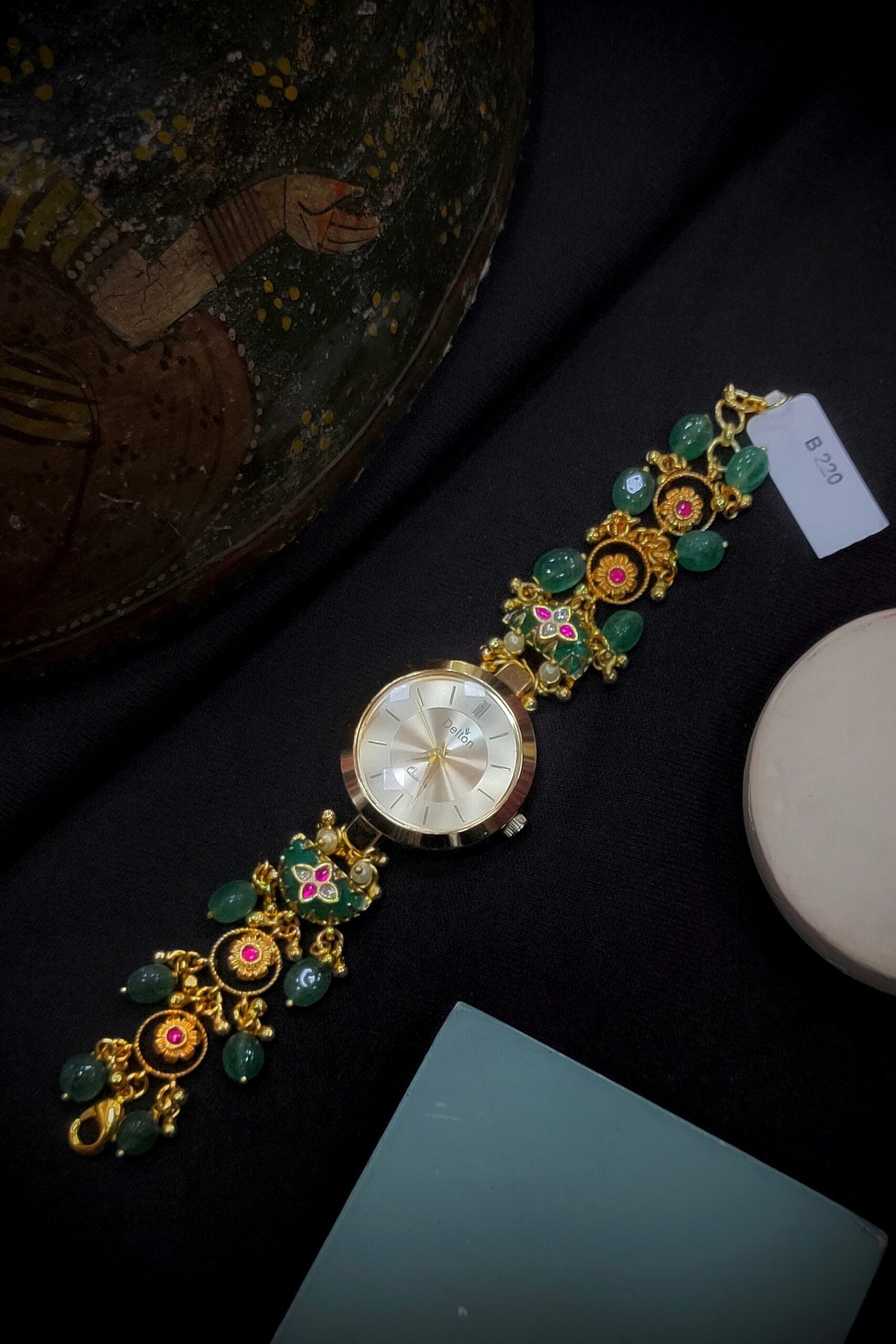 A Pachi Kundan watch typically features intricate designs that combine traditional Indian jewelry aesthetics with the functionality of a timepiece. It is adorned with Kundan stones—crafted from gold foil and set in intricate patterns—often accompanied by colorful gemstones or pearls. The watch may have a vintage or regal look, highlighting craftsmanship with a delicate, ornate bracelet or strap. Ideal for festive occasions or weddings, this watch blends elegance and cultural heritage.