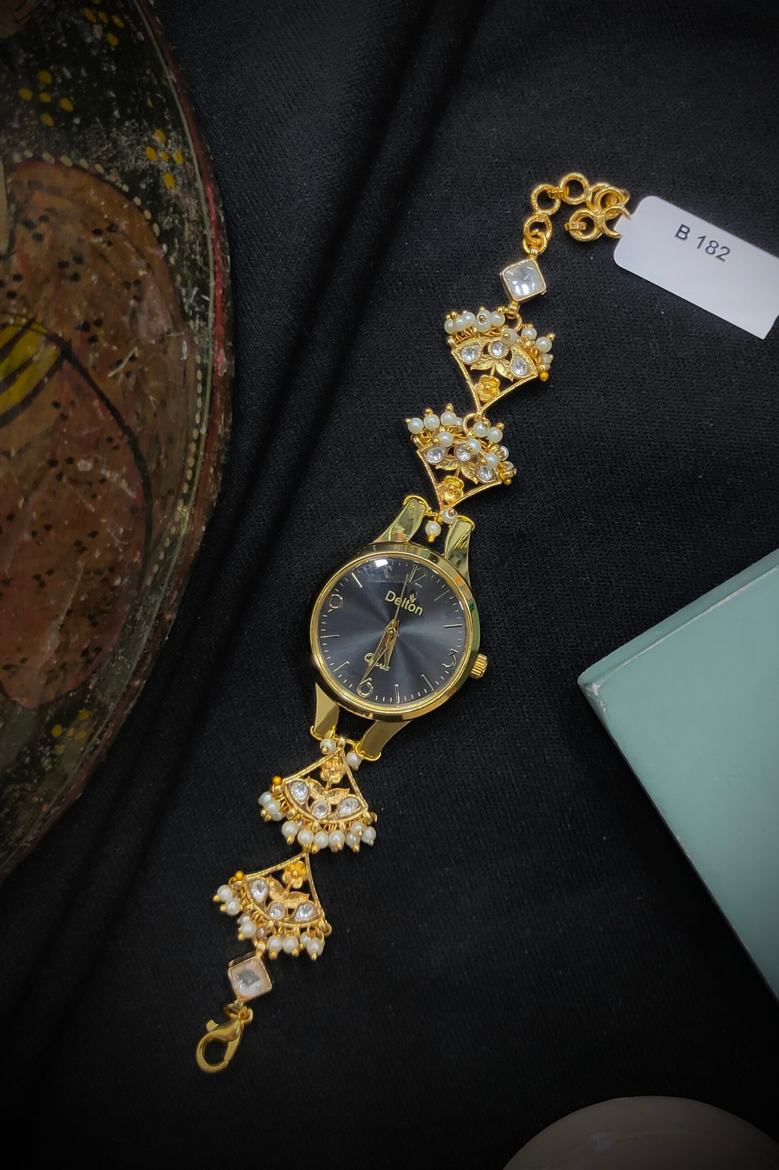 A Pachi Kundan watch typically features intricate designs that combine traditional Indian jewelry aesthetics with the functionality of a timepiece. It is adorned with Kundan stones—crafted from gold foil and set in intricate patterns—often accompanied by colorful gemstones or pearls. The watch may have a vintage or regal look, highlighting craftsmanship with a delicate, ornate bracelet or strap. Ideal for festive occasions or weddings, this watch blends elegance and cultural heritage.