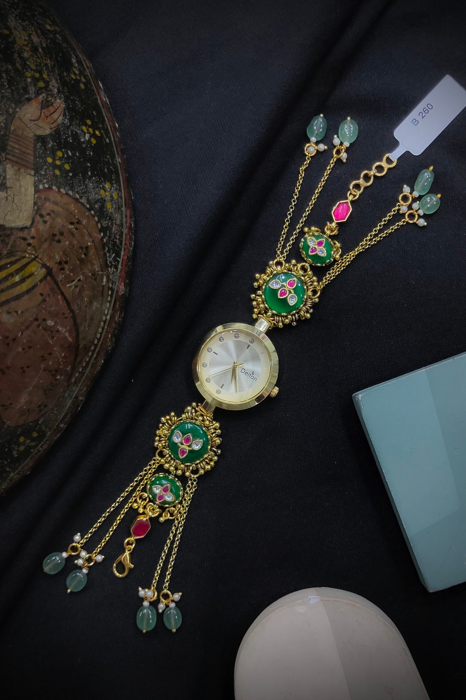 A Pachi Kundan watch typically features intricate designs that combine traditional Indian jewelry aesthetics with the functionality of a timepiece. It is adorned with Kundan stones—crafted from gold foil and set in intricate patterns—often accompanied by colorful gemstones or pearls. The watch may have a vintage or regal look, highlighting craftsmanship with a delicate, ornate bracelet or strap. Ideal for festive occasions or weddings, this watch blends elegance and cultural heritage.