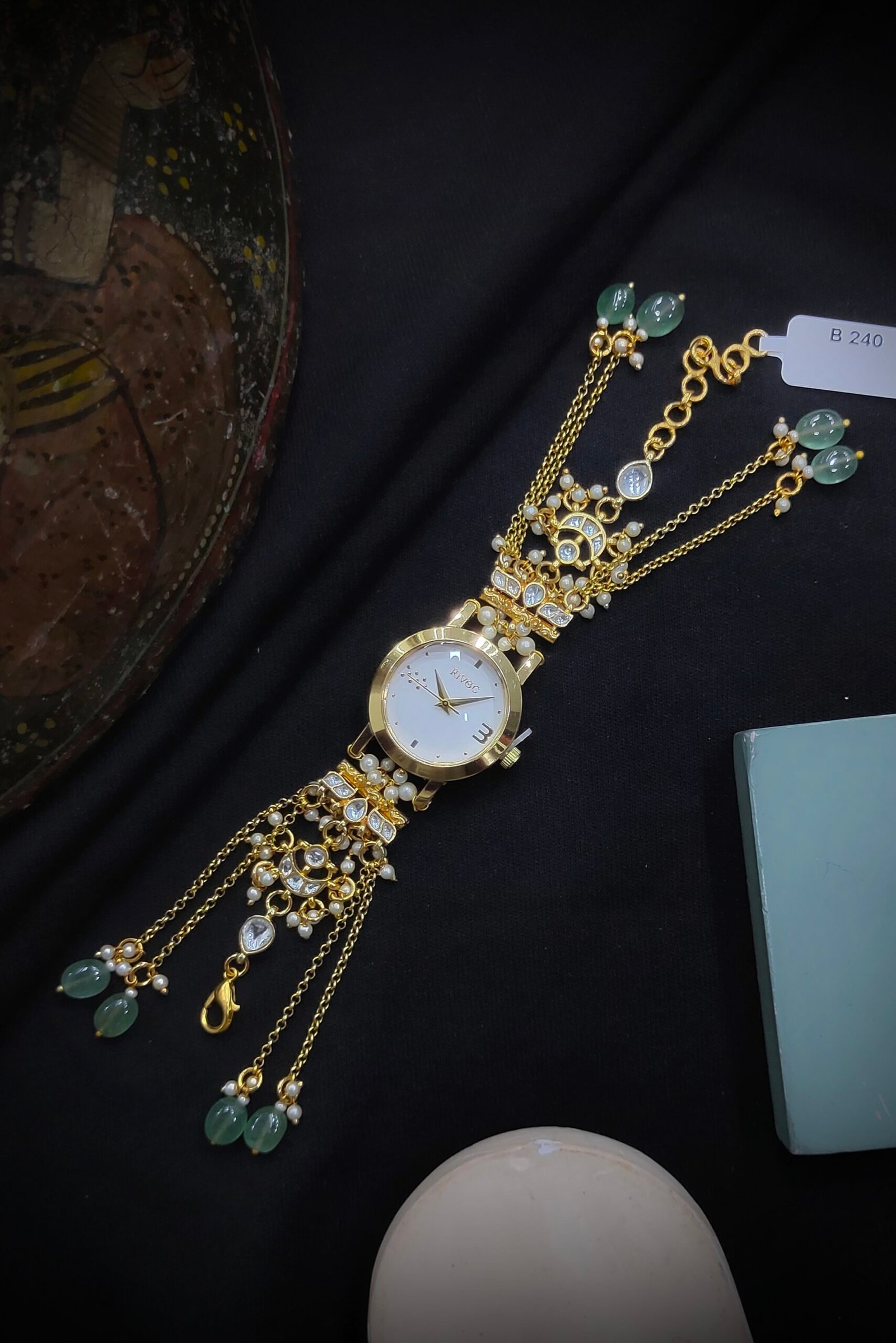 A Pachi Kundan watch typically features intricate designs that combine traditional Indian jewelry aesthetics with the functionality of a timepiece. It is adorned with Kundan stones—crafted from gold foil and set in intricate patterns—often accompanied by colorful gemstones or pearls. The watch may have a vintage or regal look, highlighting craftsmanship with a delicate, ornate bracelet or strap. Ideal for festive occasions or weddings, this watch blends elegance and cultural heritage.