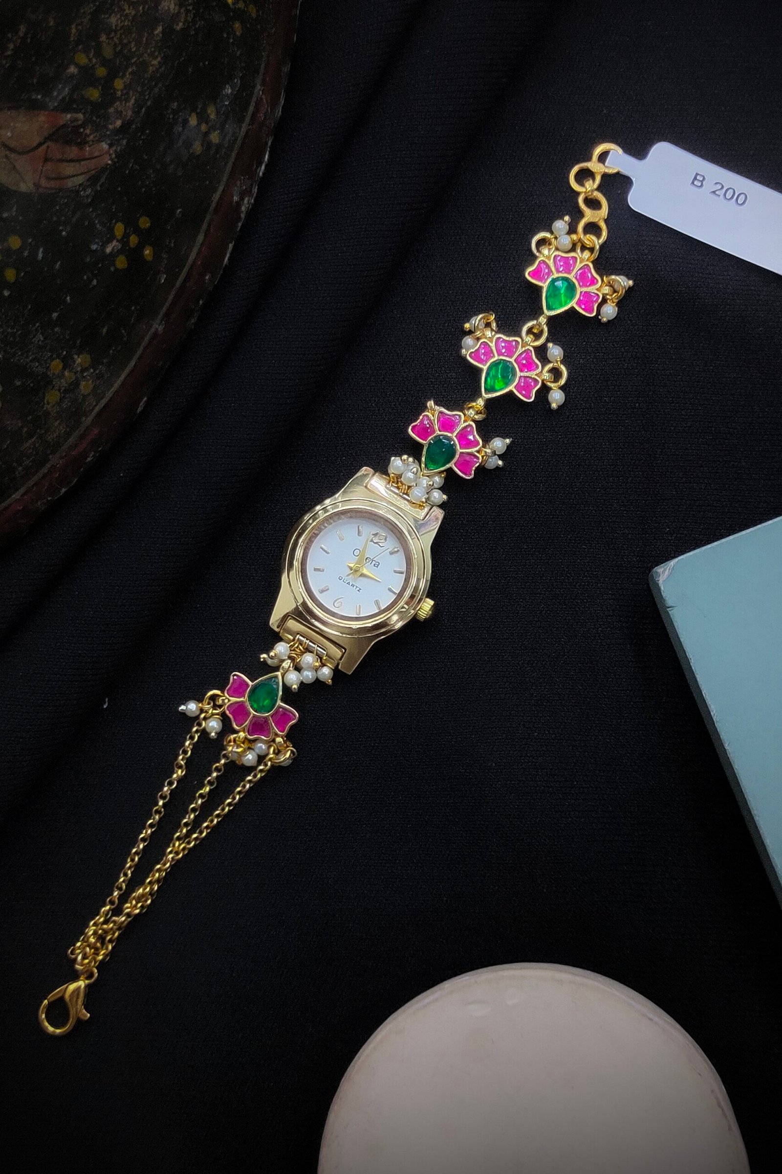 A Pachi Kundan watch typically features intricate designs that combine traditional Indian jewelry aesthetics with the functionality of a timepiece. It is adorned with Kundan stones—crafted from gold foil and set in intricate patterns—often accompanied by colorful gemstones or pearls. The watch may have a vintage or regal look, highlighting craftsmanship with a delicate, ornate bracelet or strap. Ideal for festive occasions or weddings, this watch blends elegance and cultural heritage.