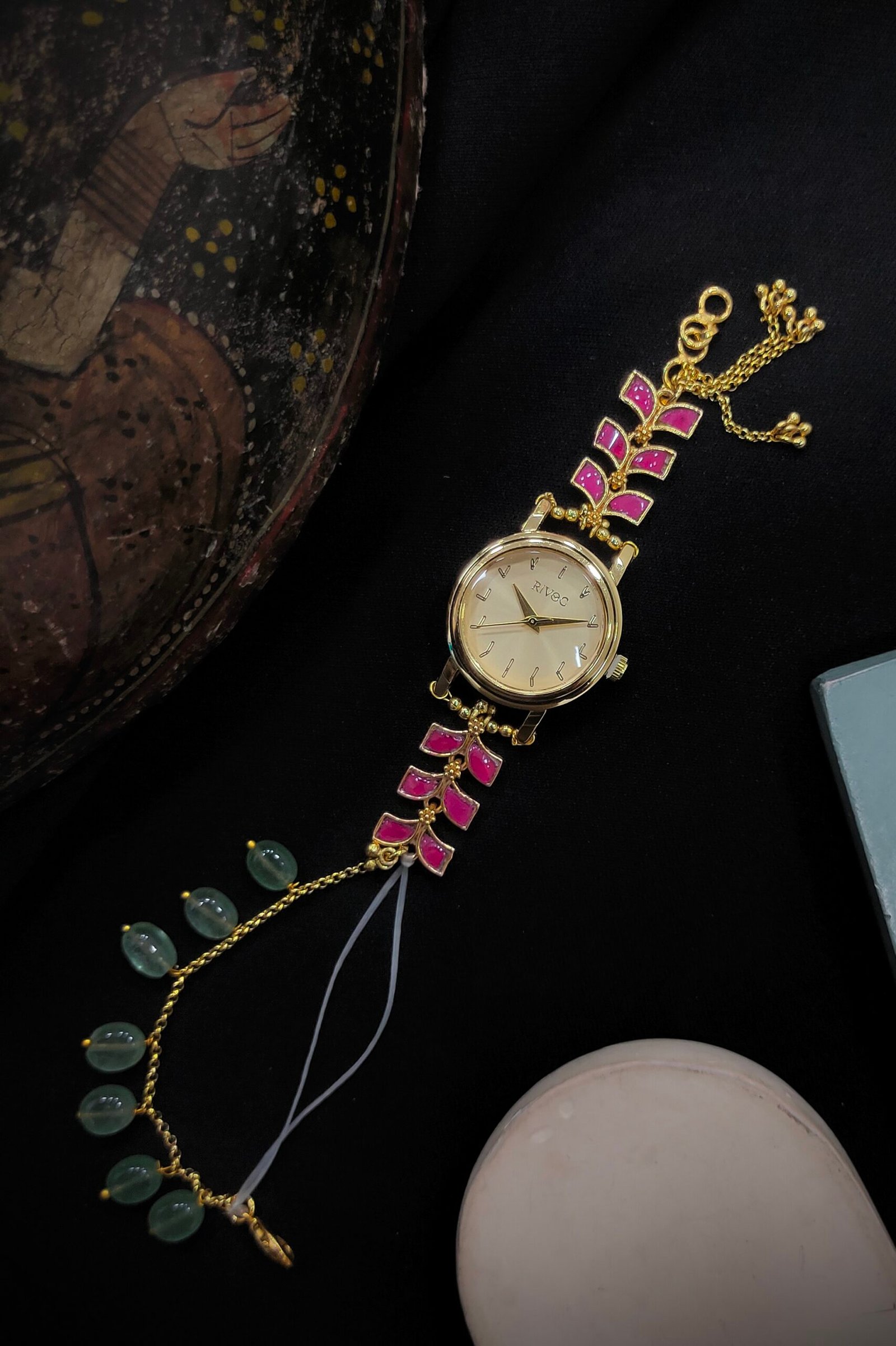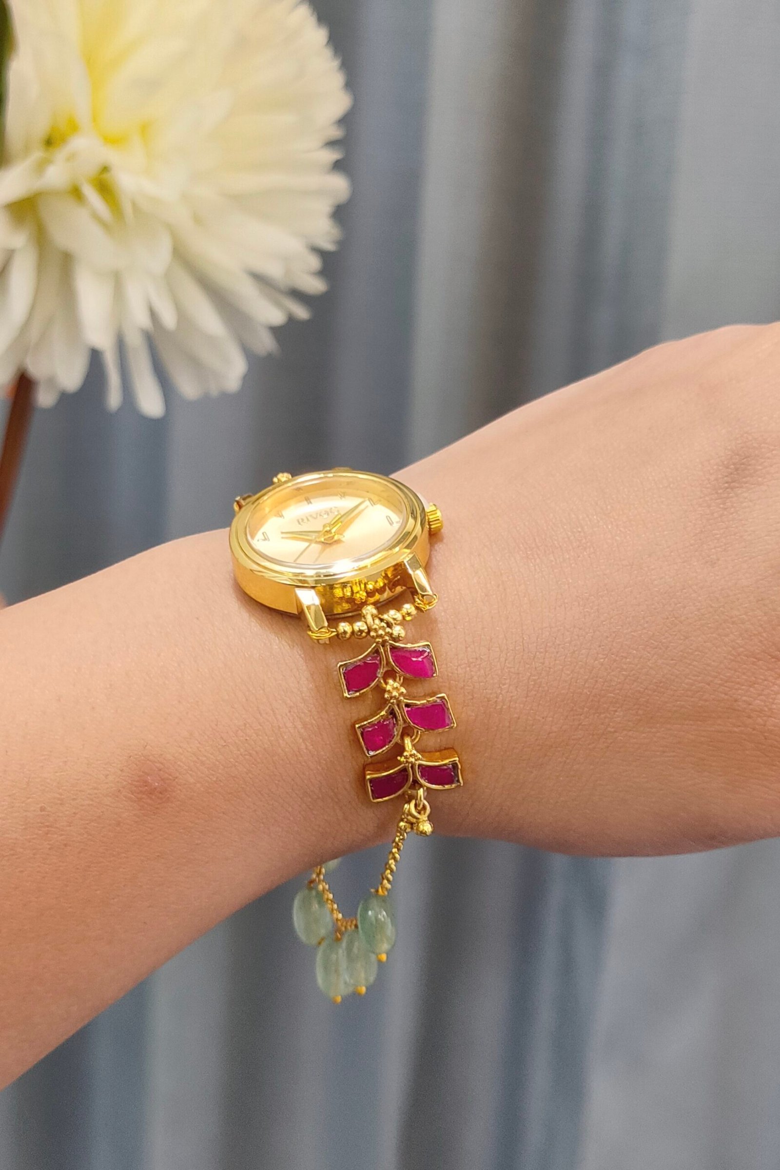 A Pachi Kundan watch typically features intricate designs that combine traditional Indian jewelry aesthetics with the functionality of a timepiece. It is adorned with Kundan stones—crafted from gold foil and set in intricate patterns—often accompanied by colorful gemstones or pearls. The watch may have a vintage or regal look, highlighting craftsmanship with a delicate, ornate bracelet or strap. Ideal for festive occasions or weddings, this watch blends elegance and cultural heritage.