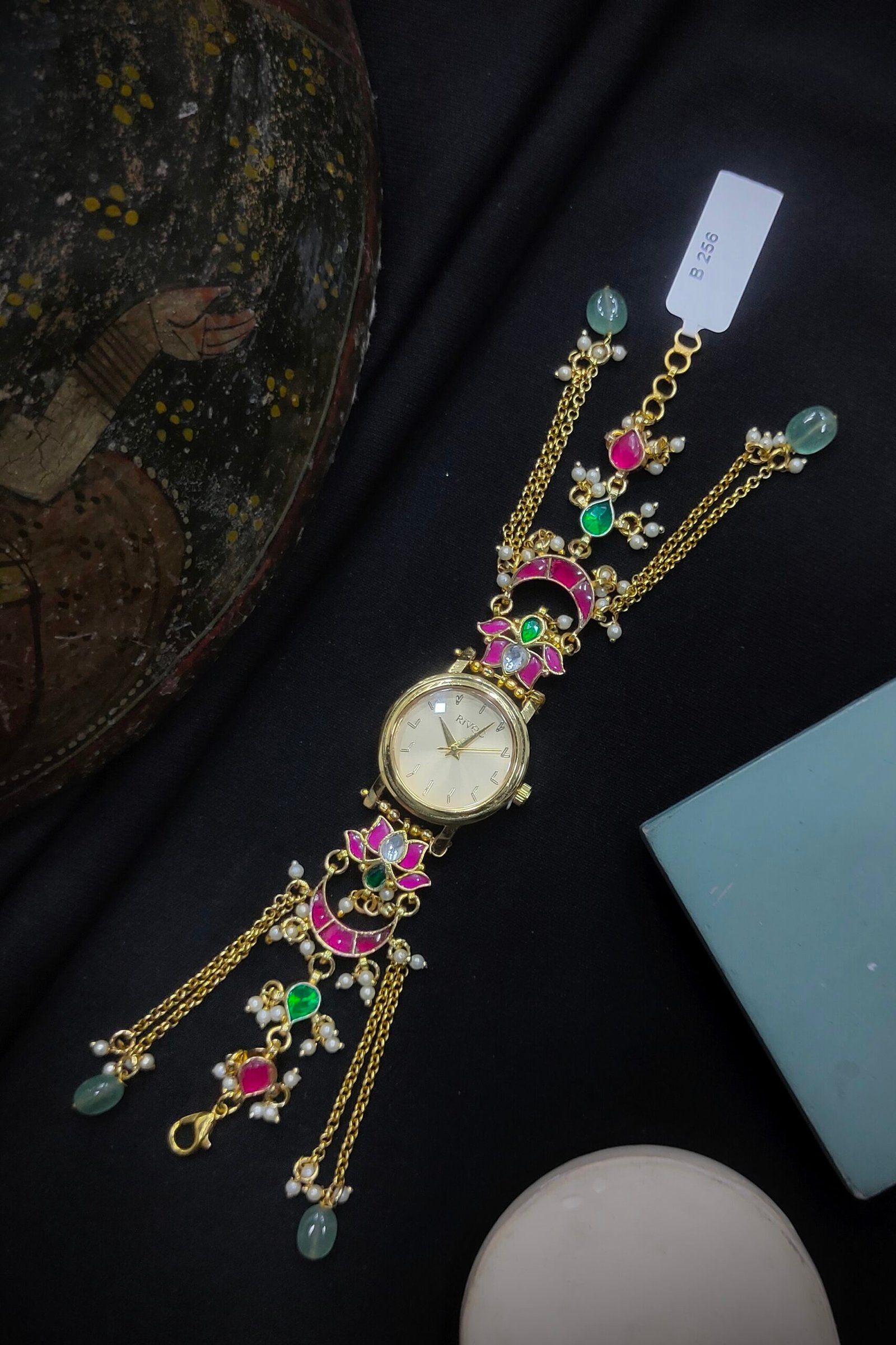 A Pachi Kundan watch typically features intricate designs that combine traditional Indian jewelry aesthetics with the functionality of a timepiece. It is adorned with Kundan stones—crafted from gold foil and set in intricate patterns—often accompanied by colorful gemstones or pearls. The watch may have a vintage or regal look, highlighting craftsmanship with a delicate, ornate bracelet or strap. Ideal for festive occasions or weddings, this watch blends elegance and cultural heritage.