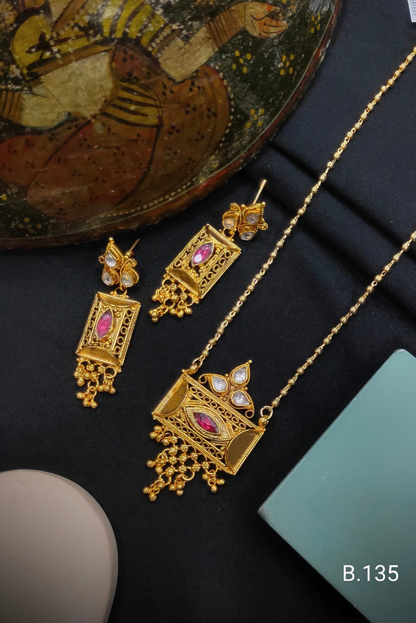 Drape yourself in timeless beauty with this intricately crafted Zaveri set. Featuring a traditional necklace and matching earrings, this set showcases a rich blend of vibrant green teardrop stones, sparkling white kundan work, and striking ruby-red accents. The golden floral chain adds a regal charm, making it perfect for festive occasions, weddings, or cultural celebrations.