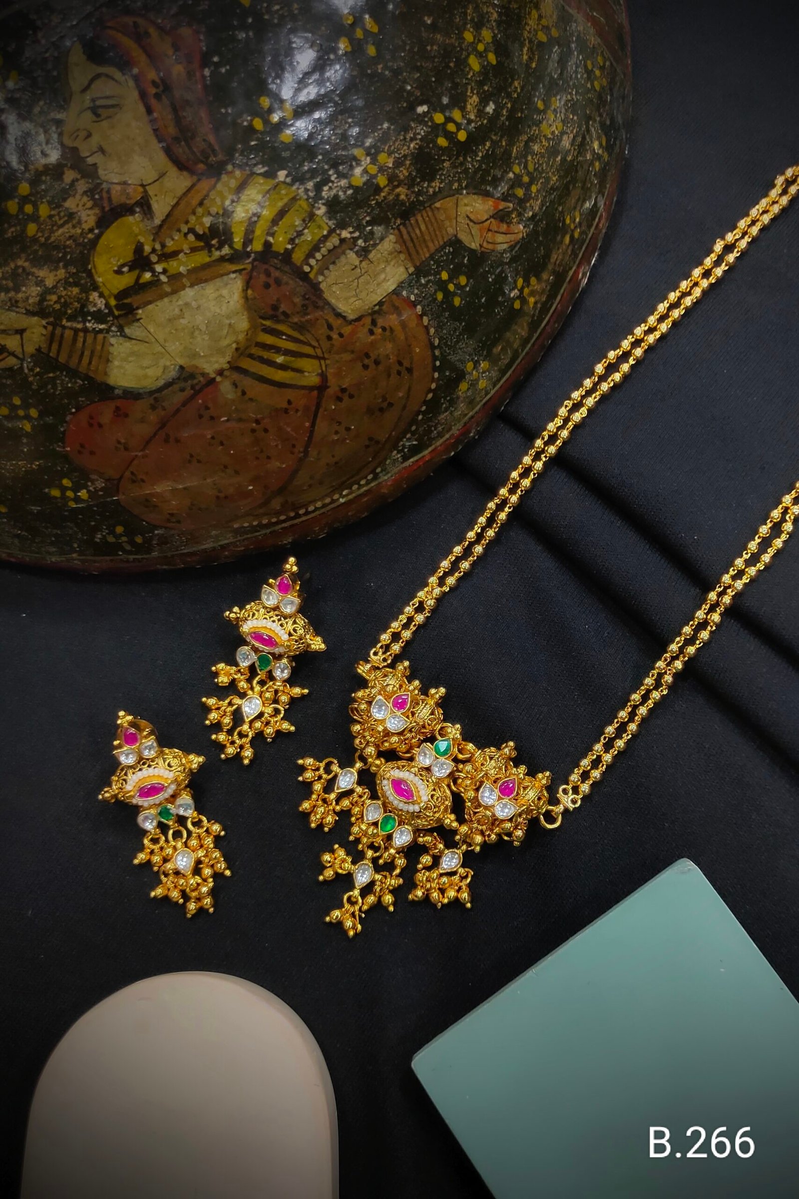 Drape yourself in timeless beauty with this intricately crafted Zaveri set. Featuring a traditional necklace and matching earrings, this set showcases a rich blend of vibrant green teardrop stones, sparkling white kundan work, and striking ruby-red accents. The golden floral chain adds a regal charm, making it perfect for festive occasions, weddings, or cultural celebrations.