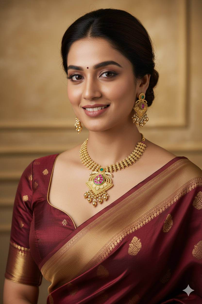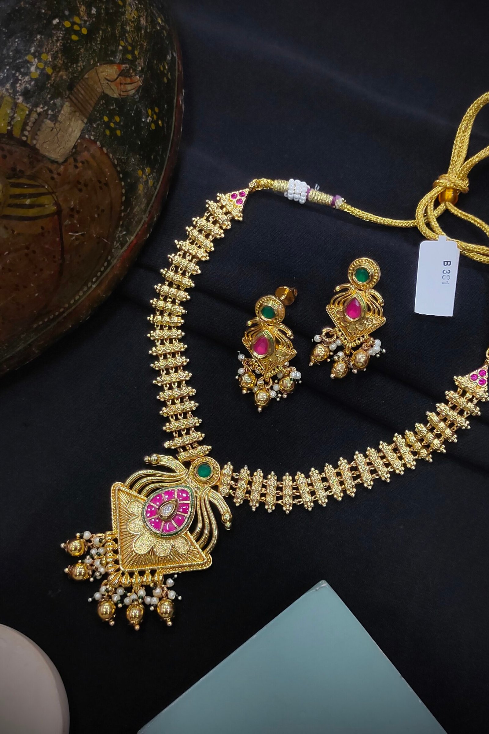 Drape yourself in timeless beauty with this intricately crafted Zaveri set. Featuring a traditional necklace and matching earrings, this set showcases a rich blend of vibrant green teardrop stones, sparkling white kundan work, and striking ruby-red accents. The golden floral chain adds a regal charm, making it perfect for festive occasions, weddings, or cultural celebrations.