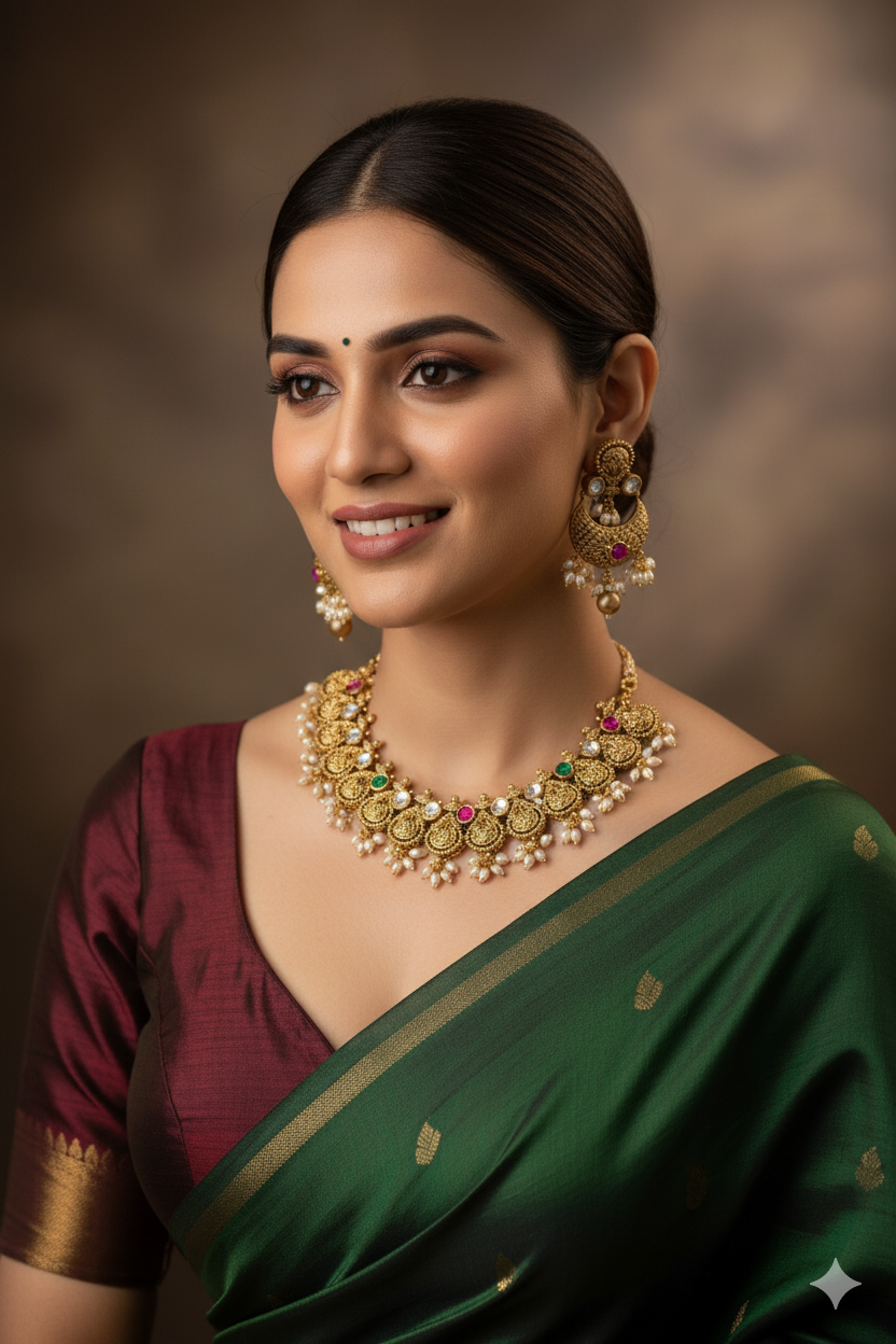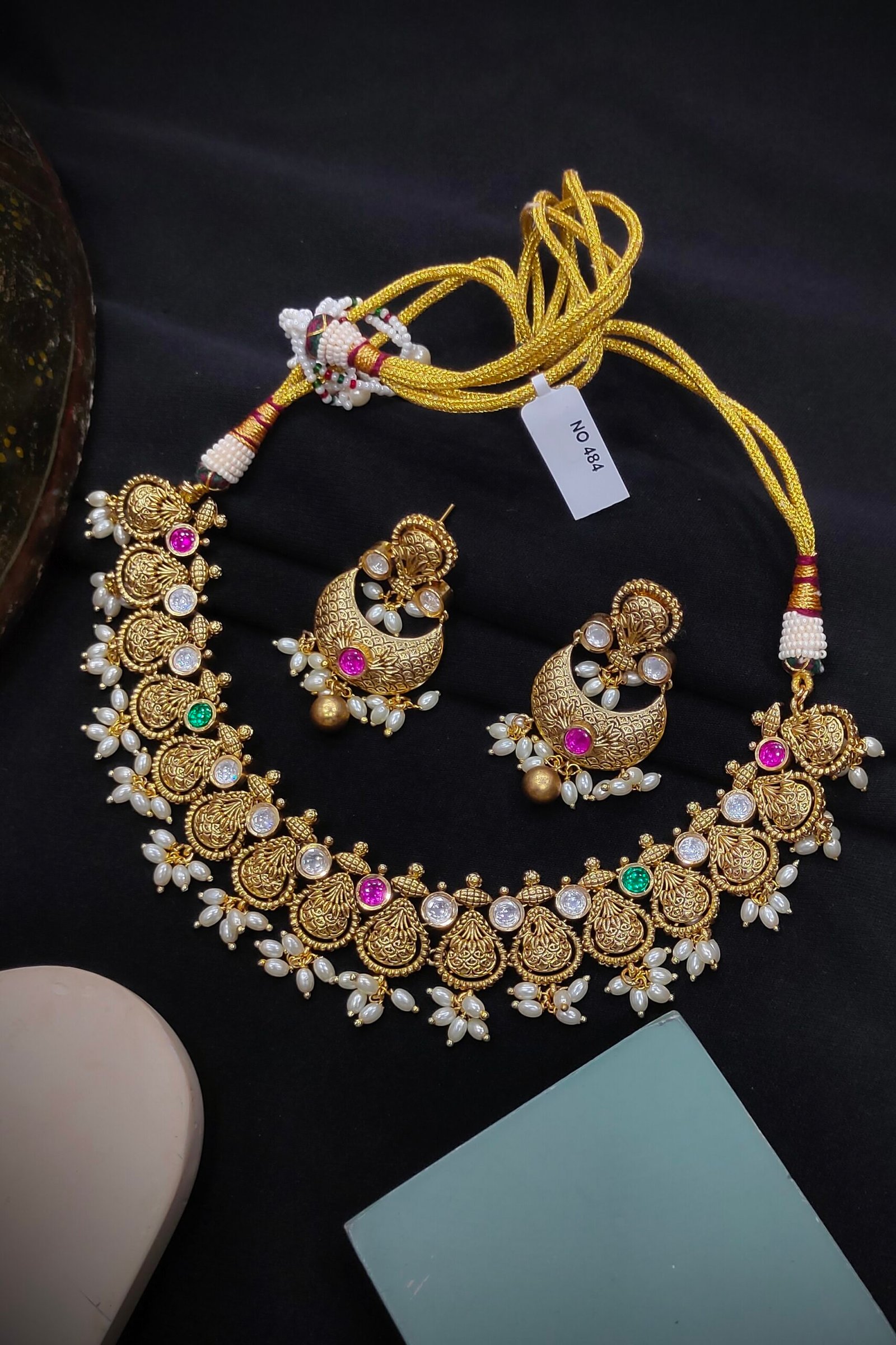 Drape yourself in timeless beauty with this intricately crafted Zaveri set. Featuring a traditional necklace and matching earrings, this set showcases a rich blend of vibrant green teardrop stones, sparkling white kundan work, and striking ruby-red accents. The golden floral chain adds a regal charm, making it perfect for festive occasions, weddings, or cultural celebrations.