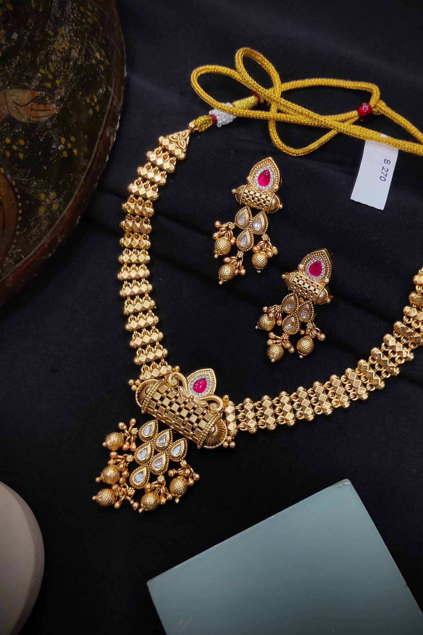 Drape yourself in timeless beauty with this intricately crafted Zaveri set. Featuring a traditional necklace and matching earrings, this set showcases a rich blend of vibrant green teardrop stones, sparkling white kundan work, and striking ruby-red accents. The golden floral chain adds a regal charm, making it perfect for festive occasions, weddings, or cultural celebrations.