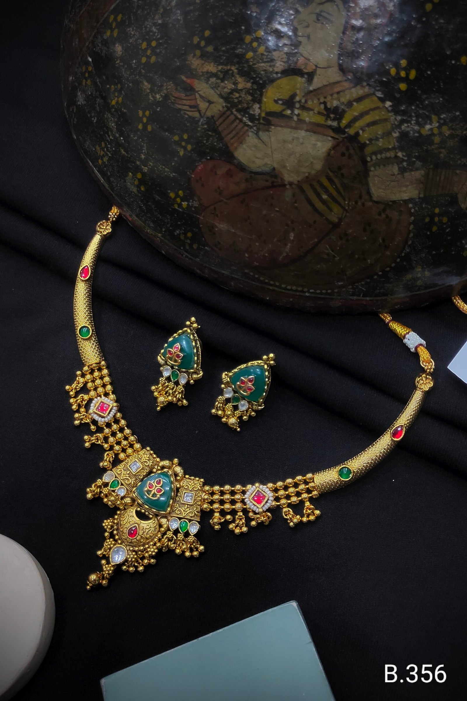 Drape yourself in timeless beauty with this intricately crafted Zaveri set. Featuring a traditional necklace and matching earrings, this set showcases a rich blend of vibrant green teardrop stones, sparkling white kundan work, and striking ruby-red accents. The golden floral chain adds a regal charm, making it perfect for festive occasions, weddings, or cultural celebrations.